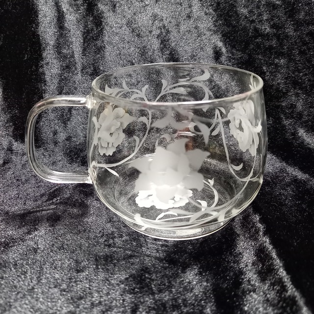 透明な耐熱カップに優雅な唐花唐草紋様を彫りました。 耐熱ガラスですので、熱いお茶などにもお使い戴けます。(ガラスが薄手なので熱湯にはご注意下さい。) 飲み口8.4直径㎝✕高さ7.7㎝。 ※食洗機・電子レンジ不可