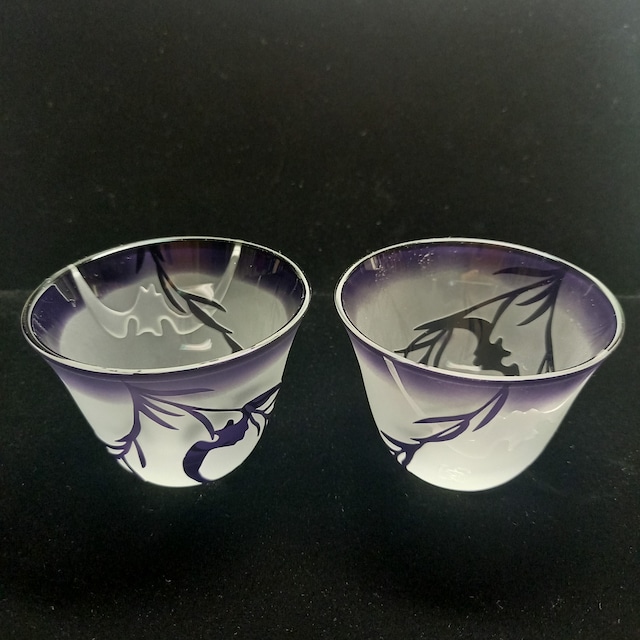 落ち着いた紫色の冷茶碗用被せガラスに、柳の間を飛ぶ蝙蝠を彫りました。福を呼ぶ蝙蝠柄がシンプルモダン。 色消し、艶あり、暈しのコントラストと紋様の動きがきれいです。 直径8.3㎝✕高さ5.8㎝。 ※グラスは1個の値段になります。 ※熱湯を入れたり、食洗機での洗浄、電子レンジの使用は破損の原因になりますのでお控え下さい。