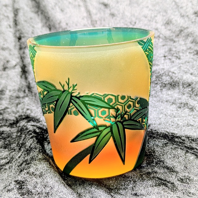 縁起の良い竹笹紋様を、緑色の被せガラスに彫りました。竹には更に縁起良く亀甲と紗綾形紋様が彫られています。 「Ⅲ」はグラスの素材が違い、下地にアンバー色のガラス、被せに常盤色のガラスが使用されている2色グラスを使用しています。 深いお色味が落ち着きを醸し出している、大人感のあるグラスです。 直径8.4㎝✕高さ9.0㎝。