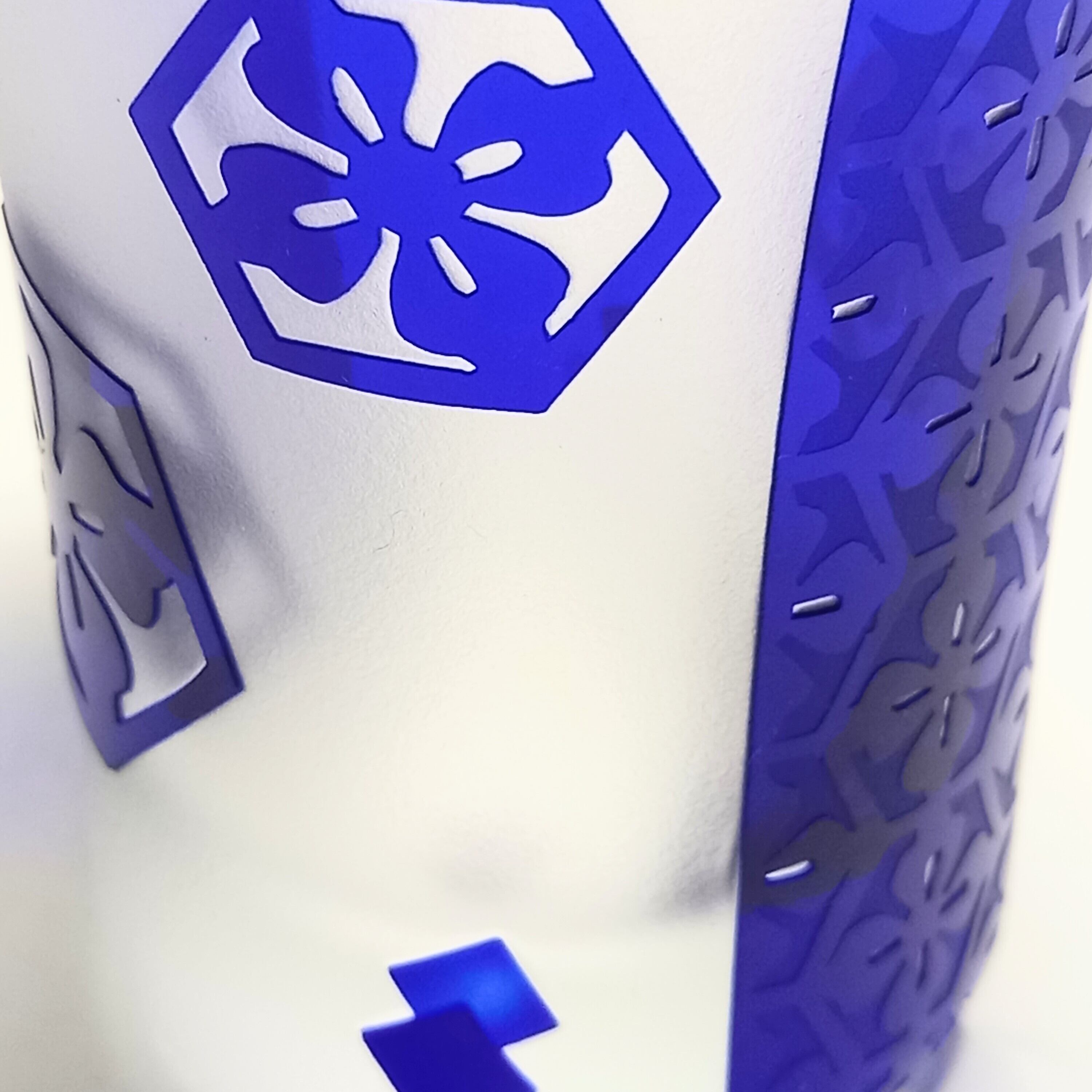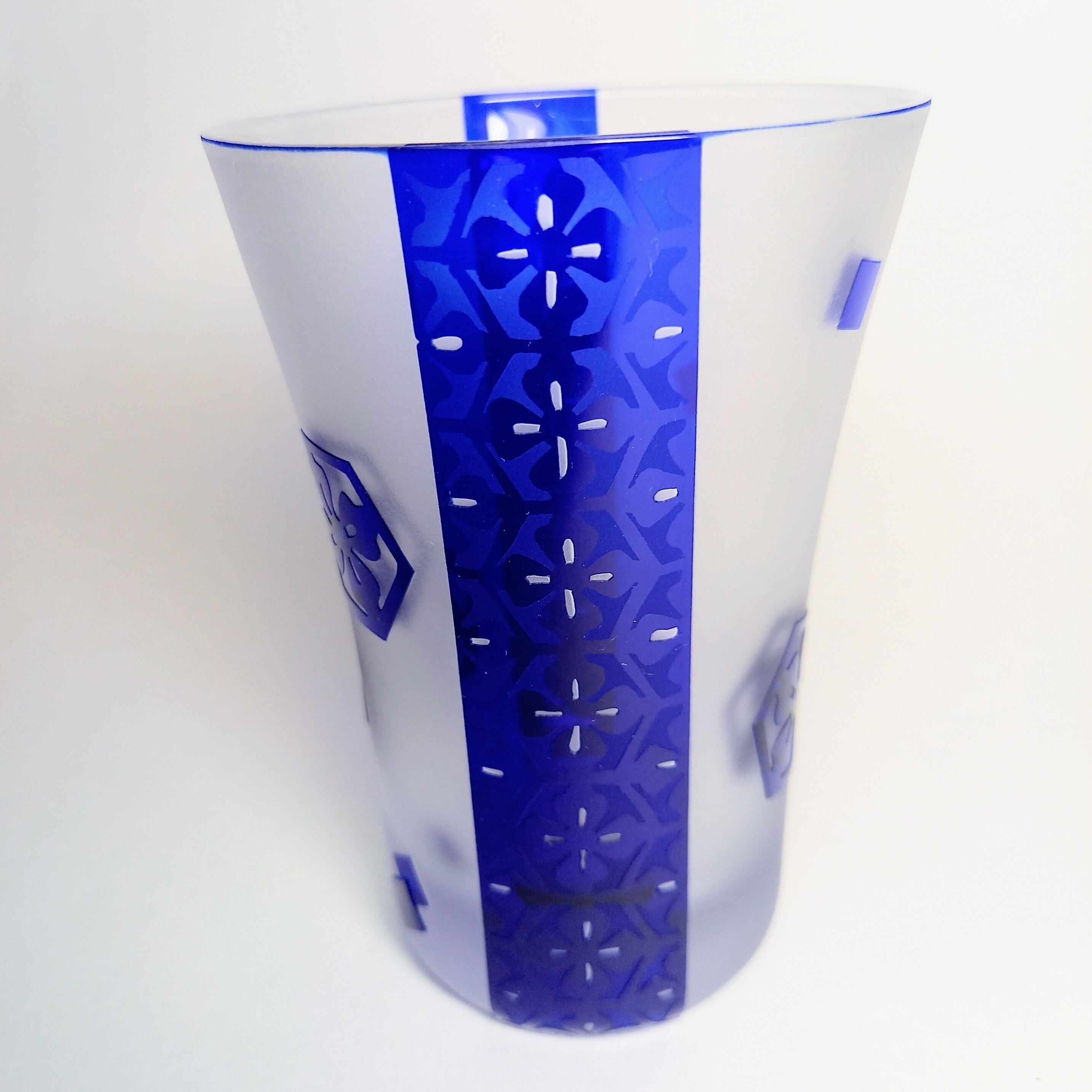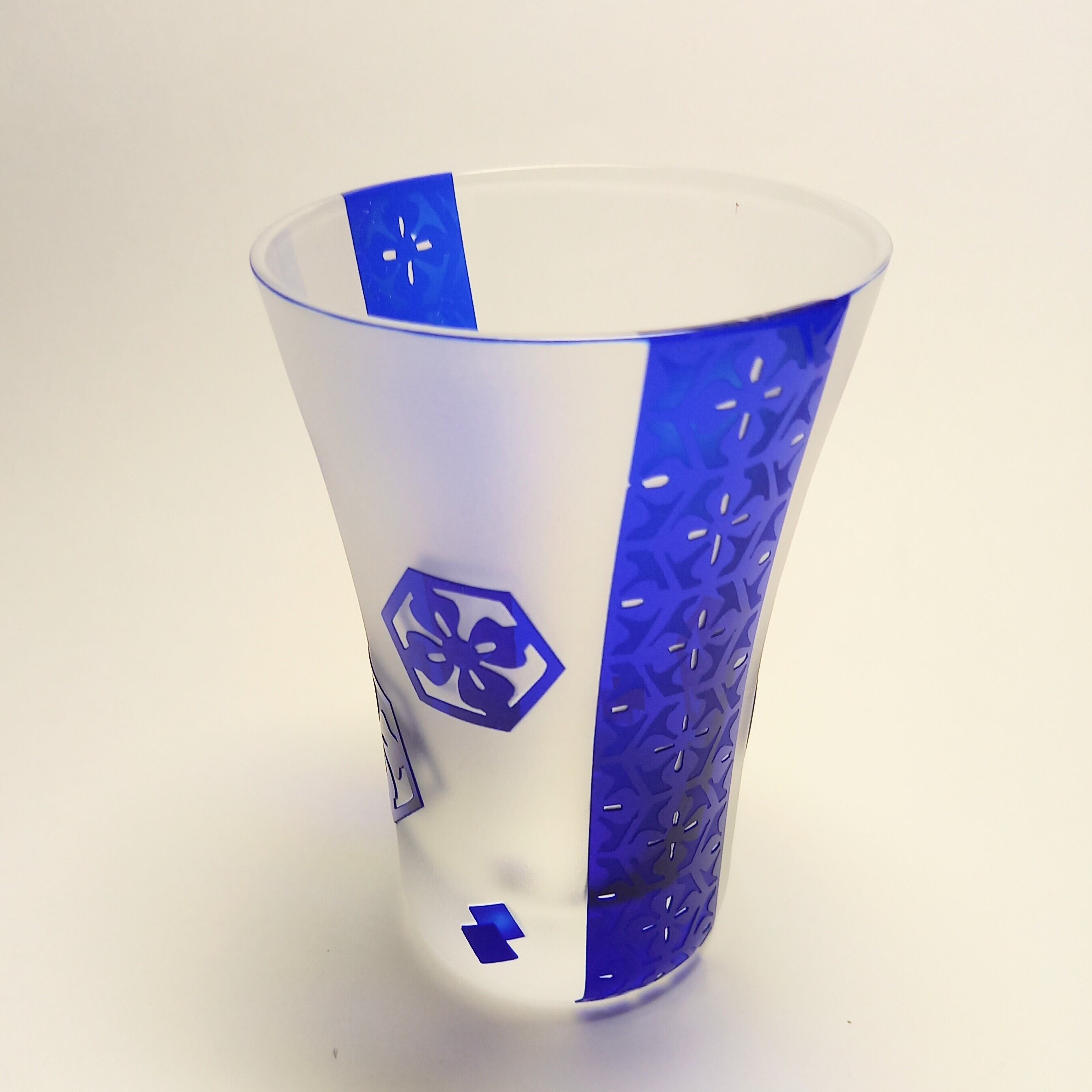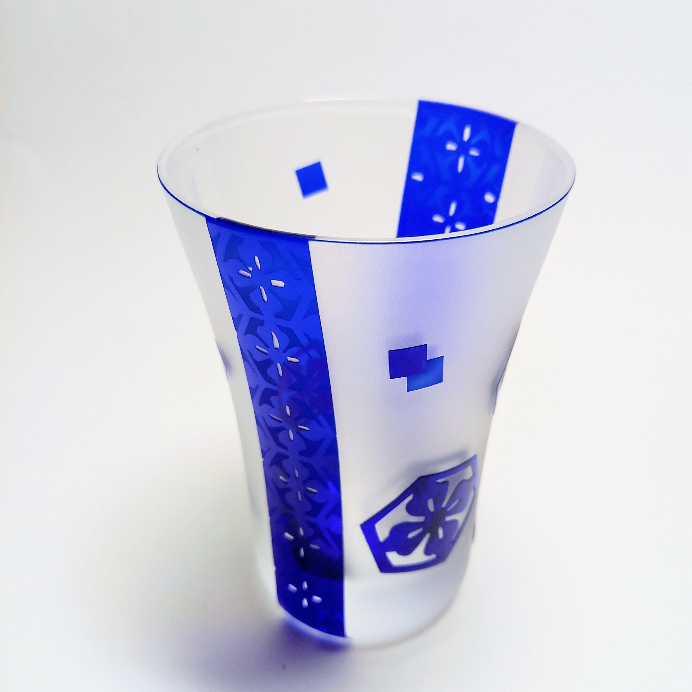 花菱紋様を色々配置して、瑠璃色の被せガラスに彫りました。