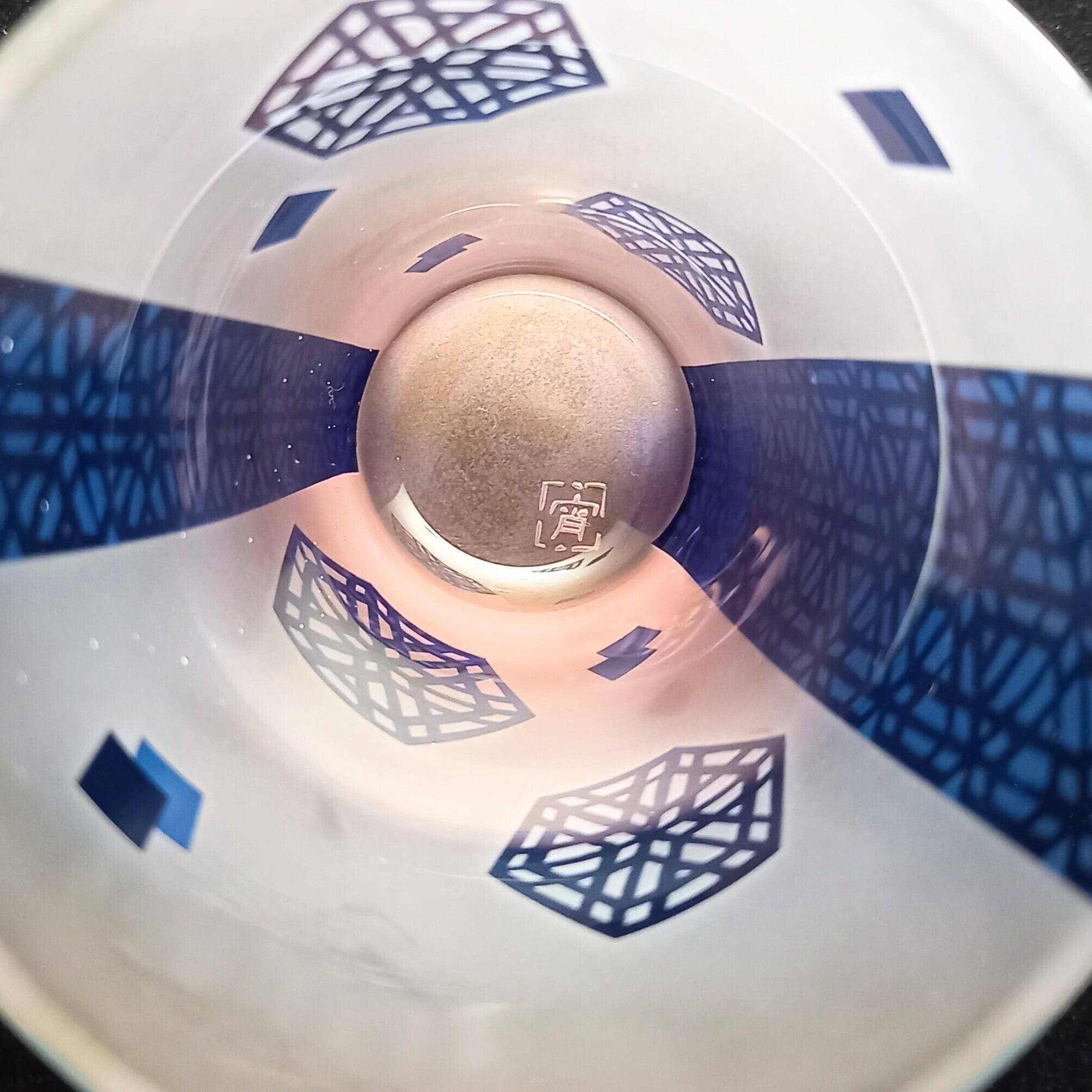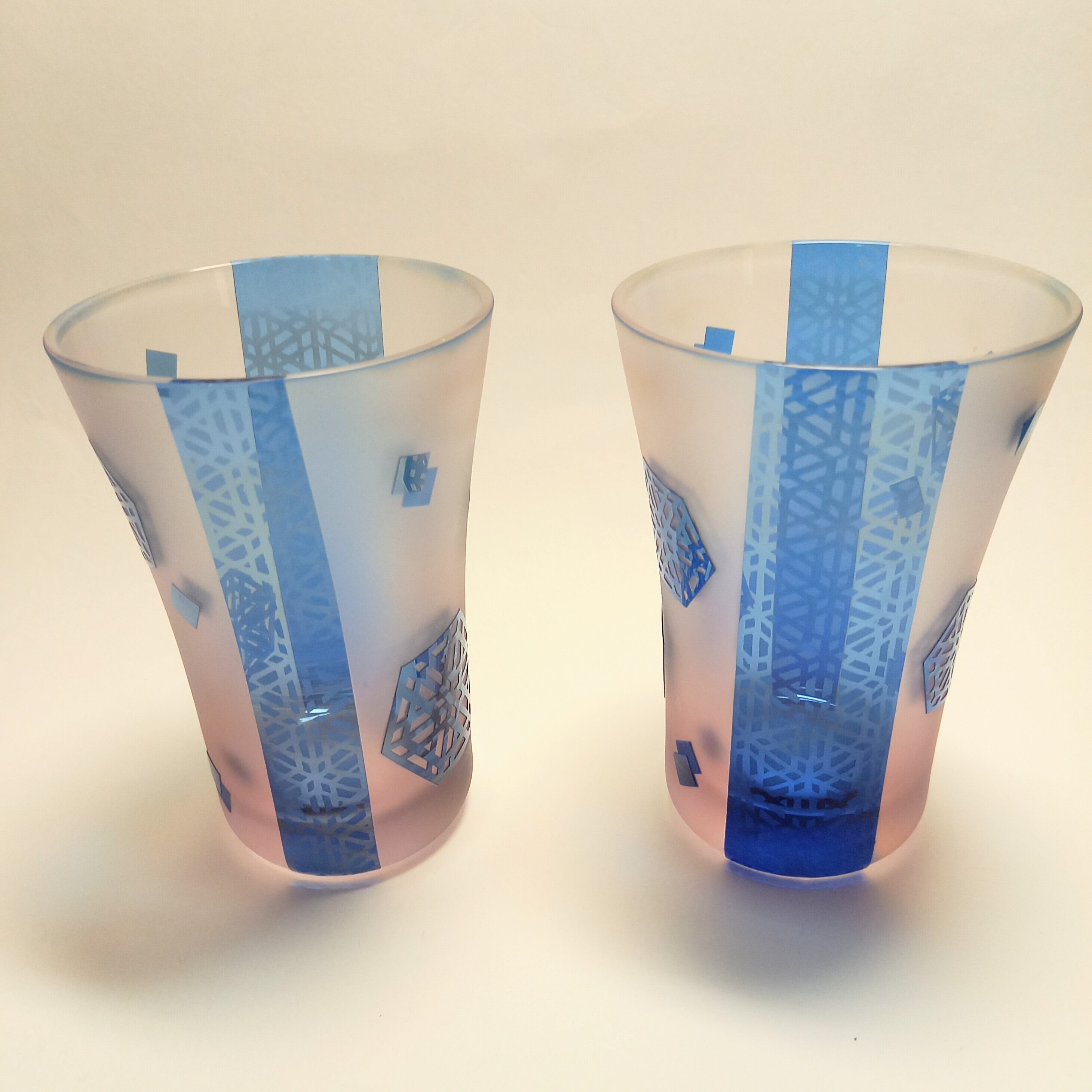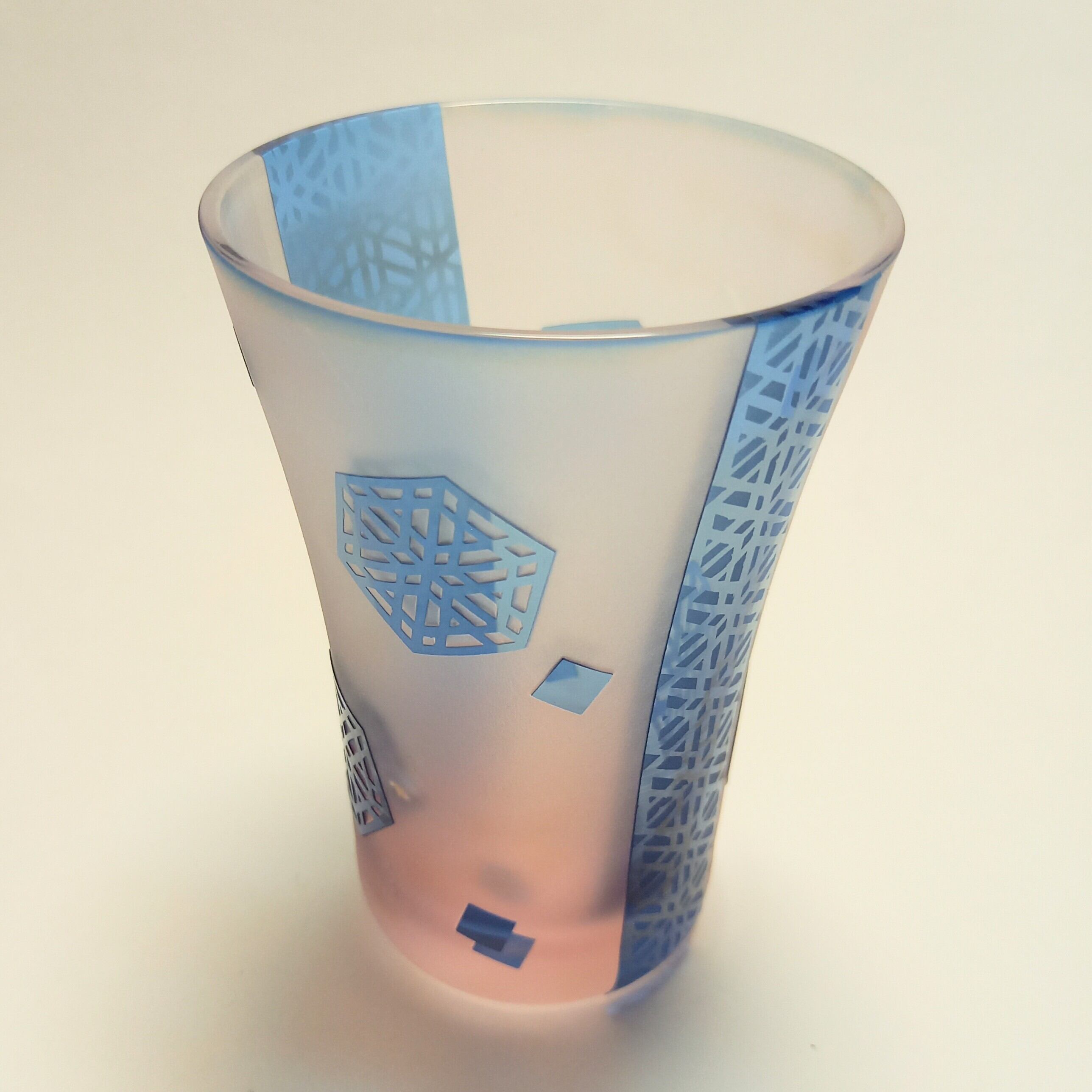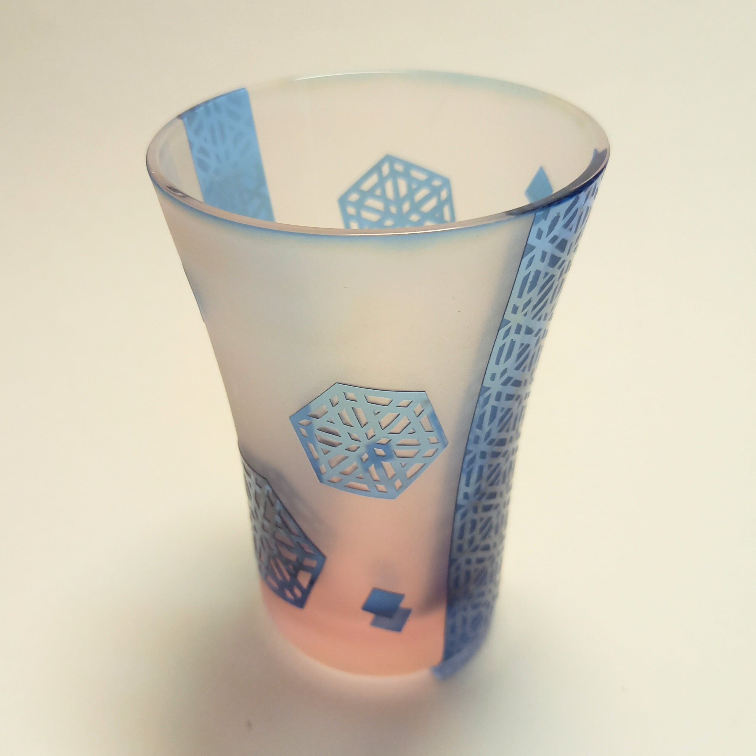 格子麻の葉紋様を色々配置して、水色とピンク色の被せガラスに彫りました。帯にも艶消しで紋様が彫ってあります。
