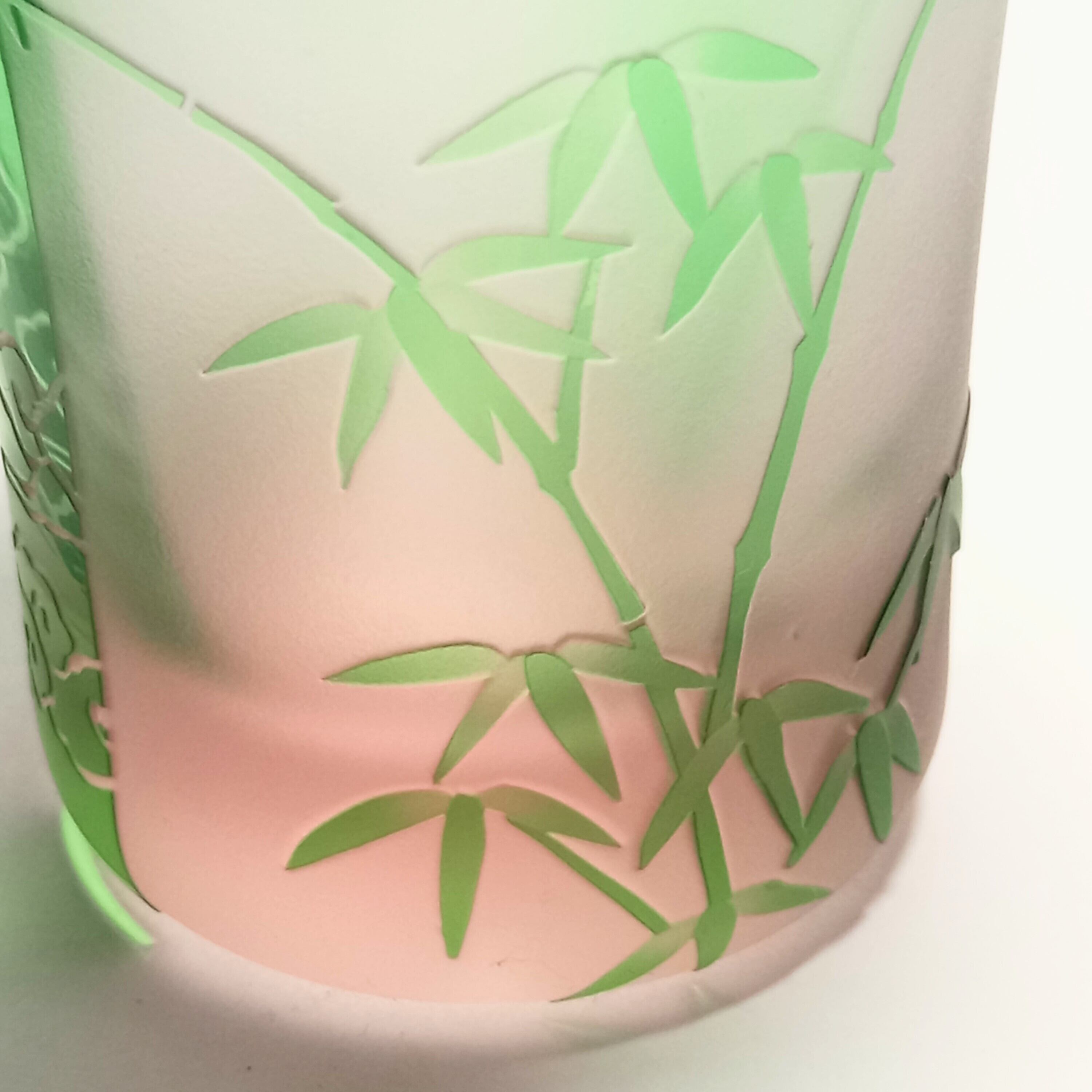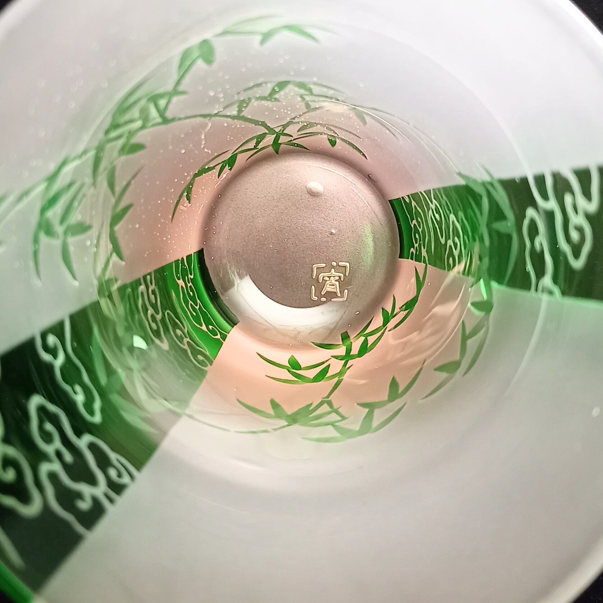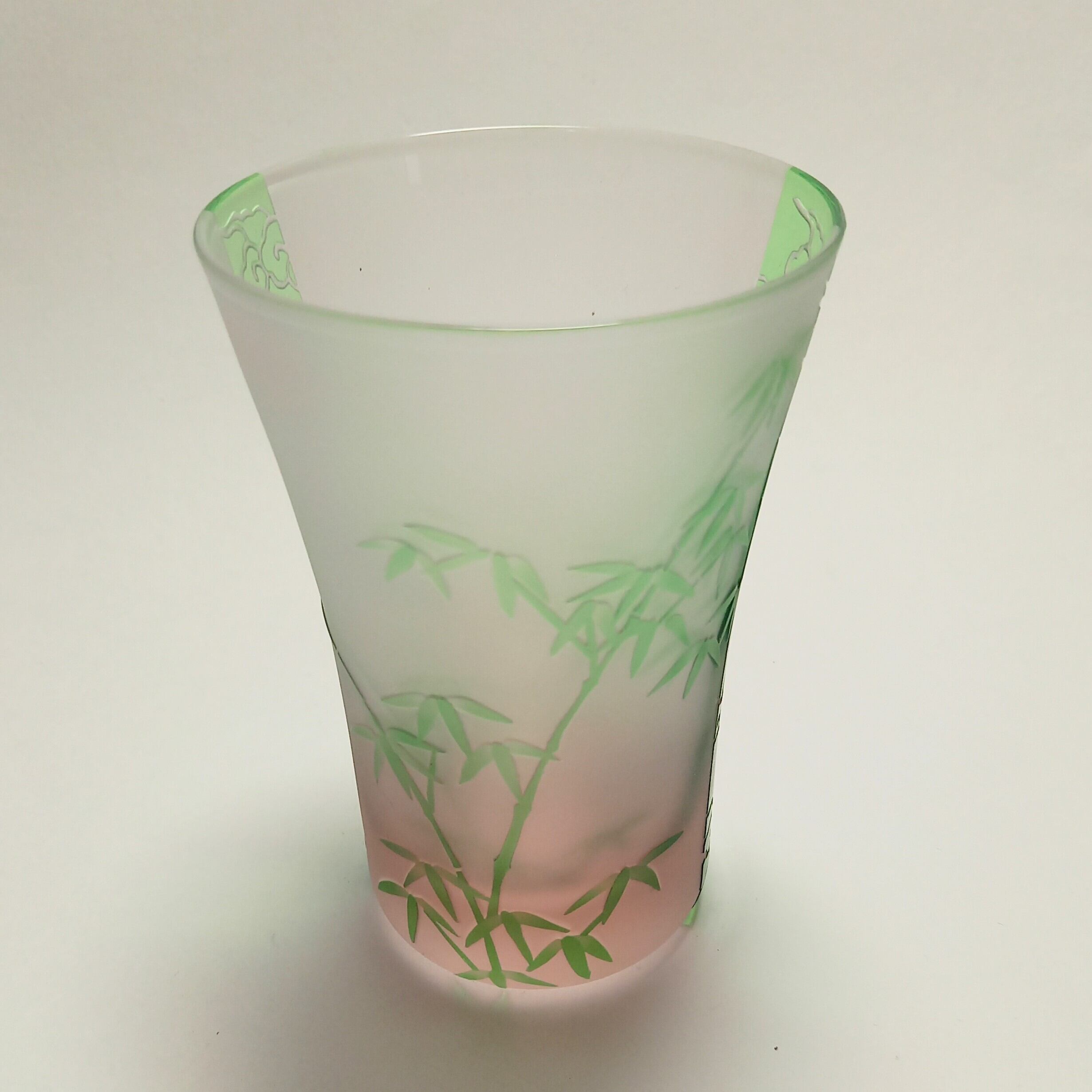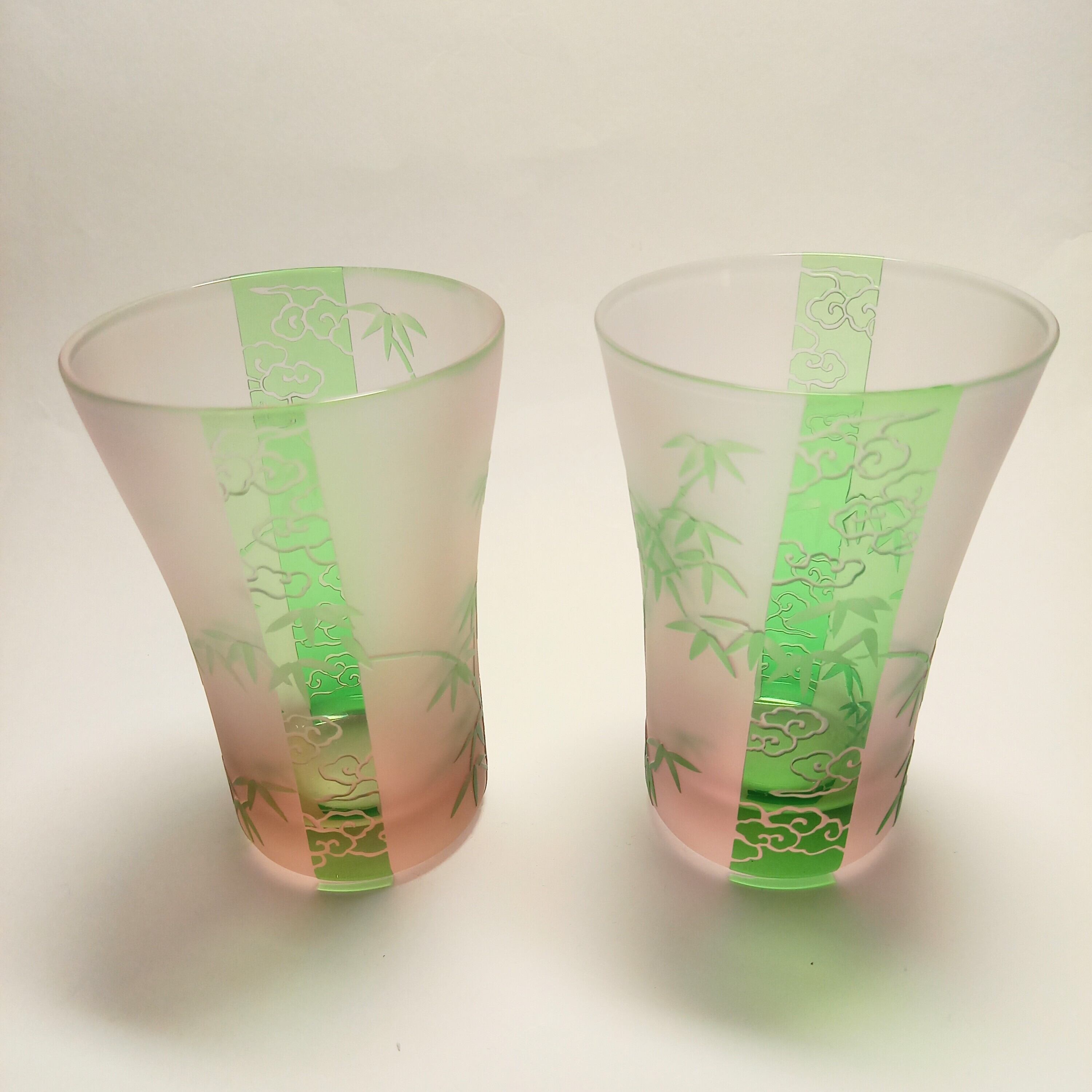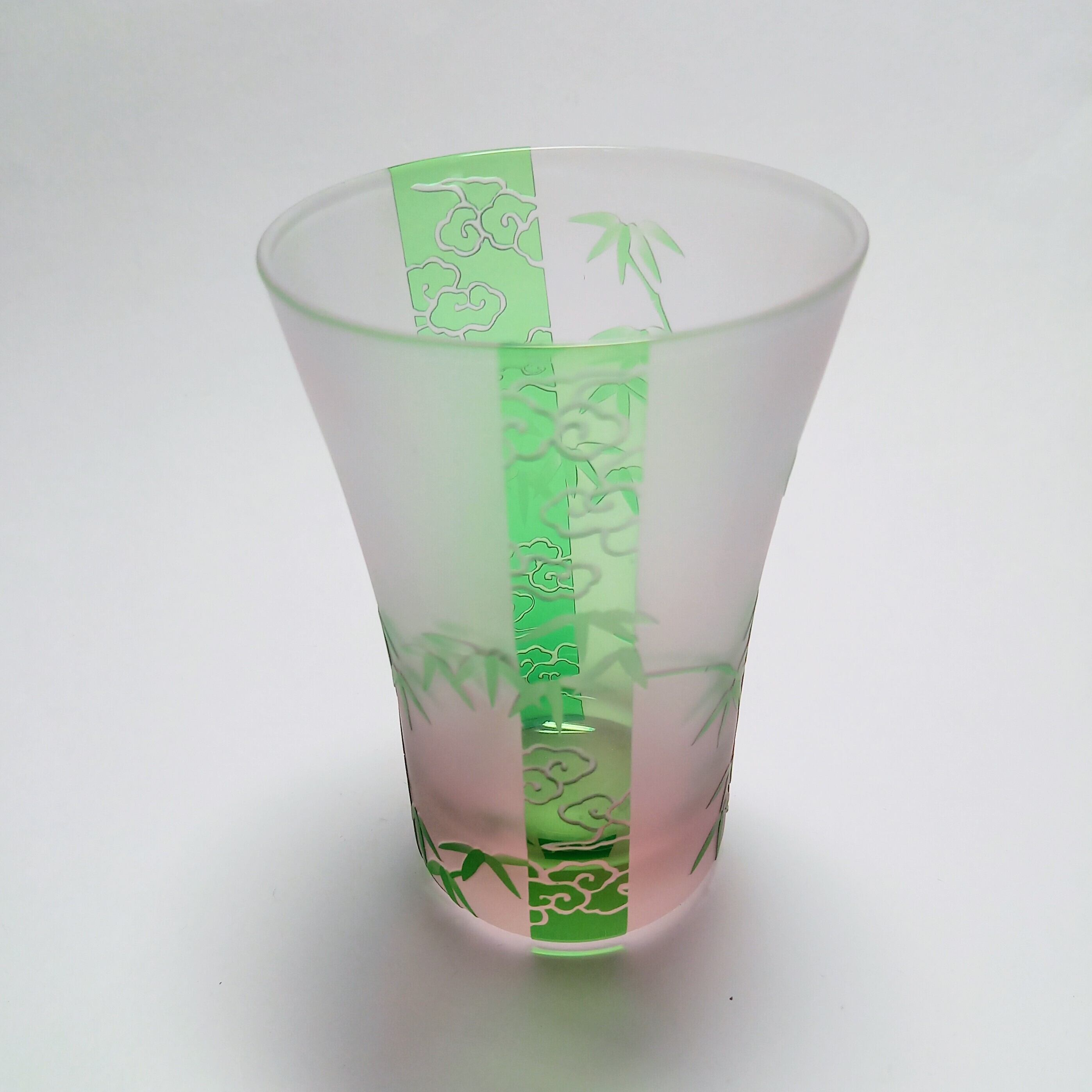 帯には雲、間には竹の紋様を、緑とピンクの被せガラスに彫りました。底から立ち上るピンク色と雲竹紋様が夢幻な風情です。