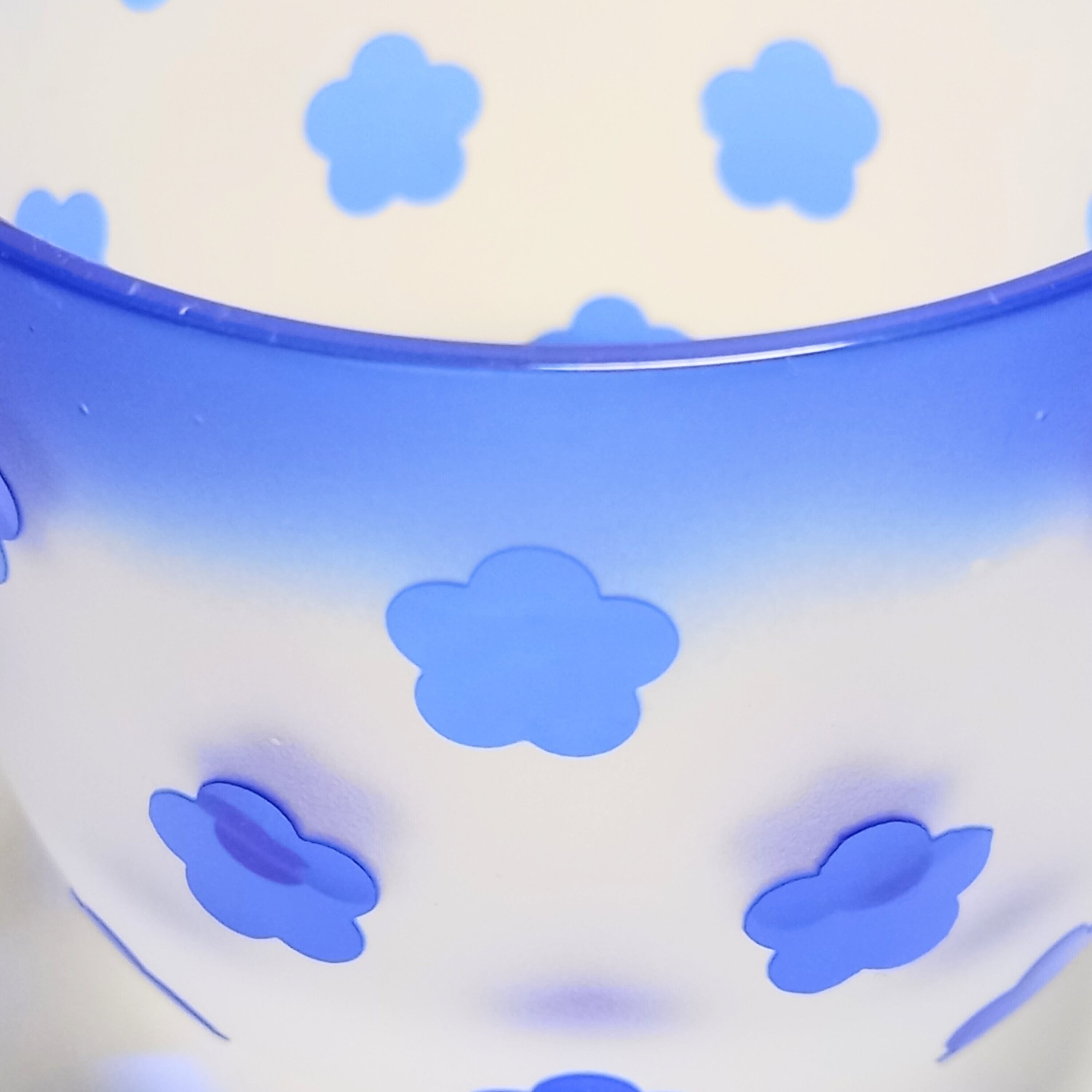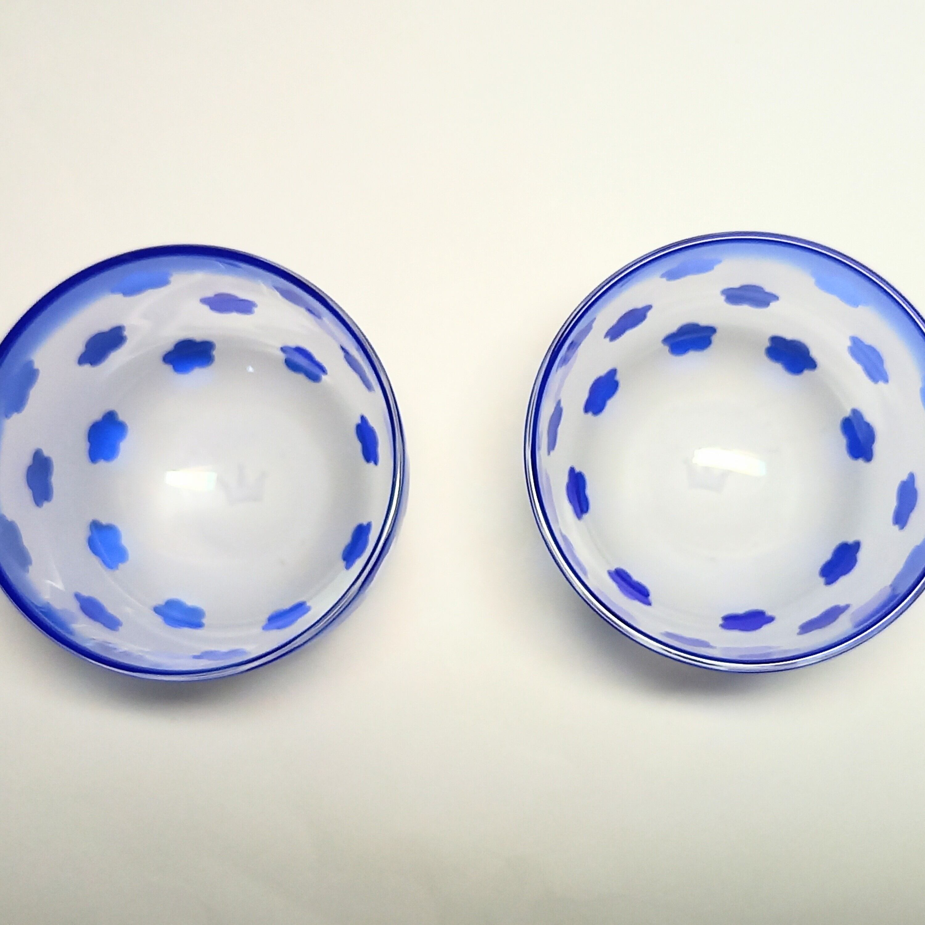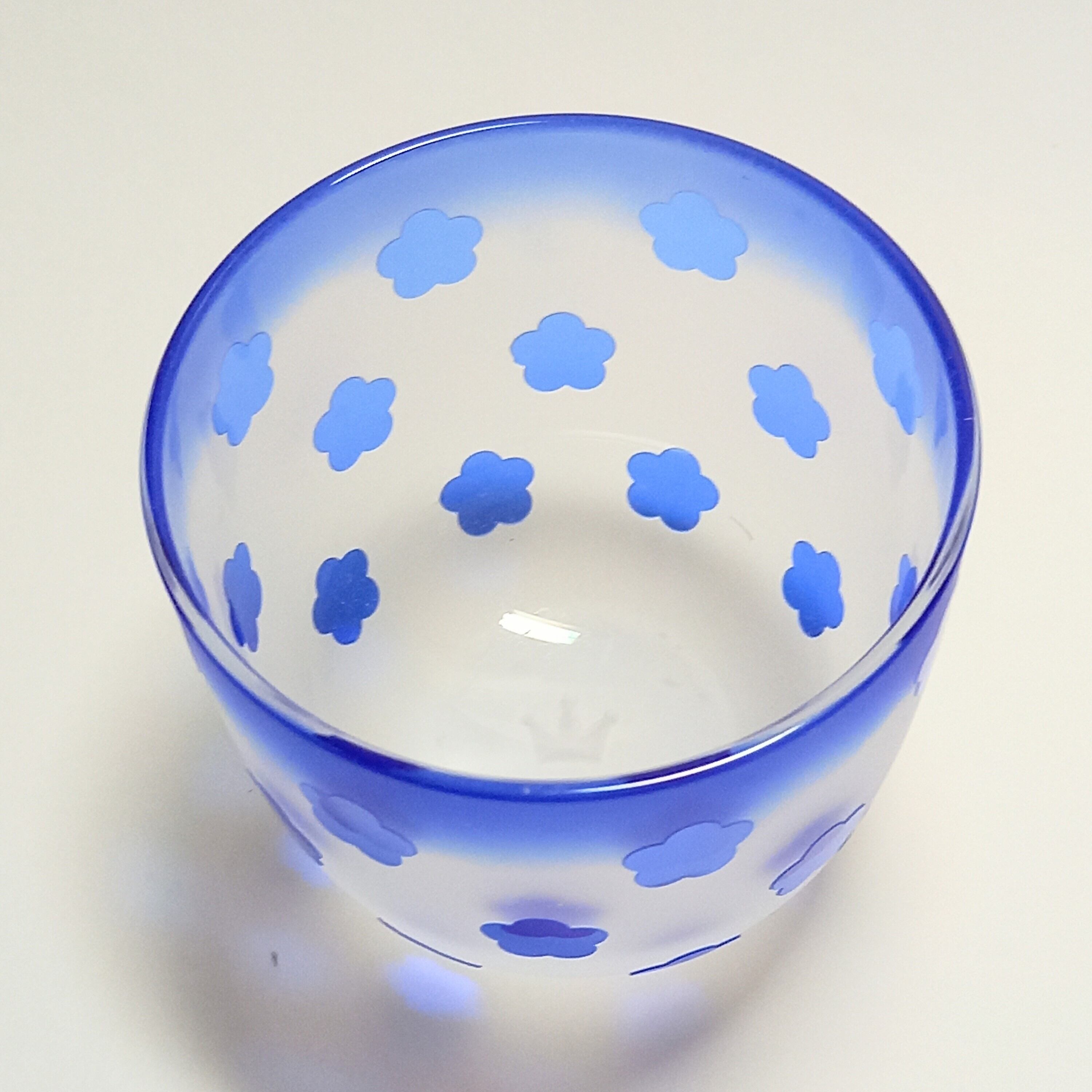可愛らしい花柄を並べて、瑠璃色の冷茶碗用被せガラスに彫りました。底にはちょこんと王冠が彫られていて更に可愛らしいです。