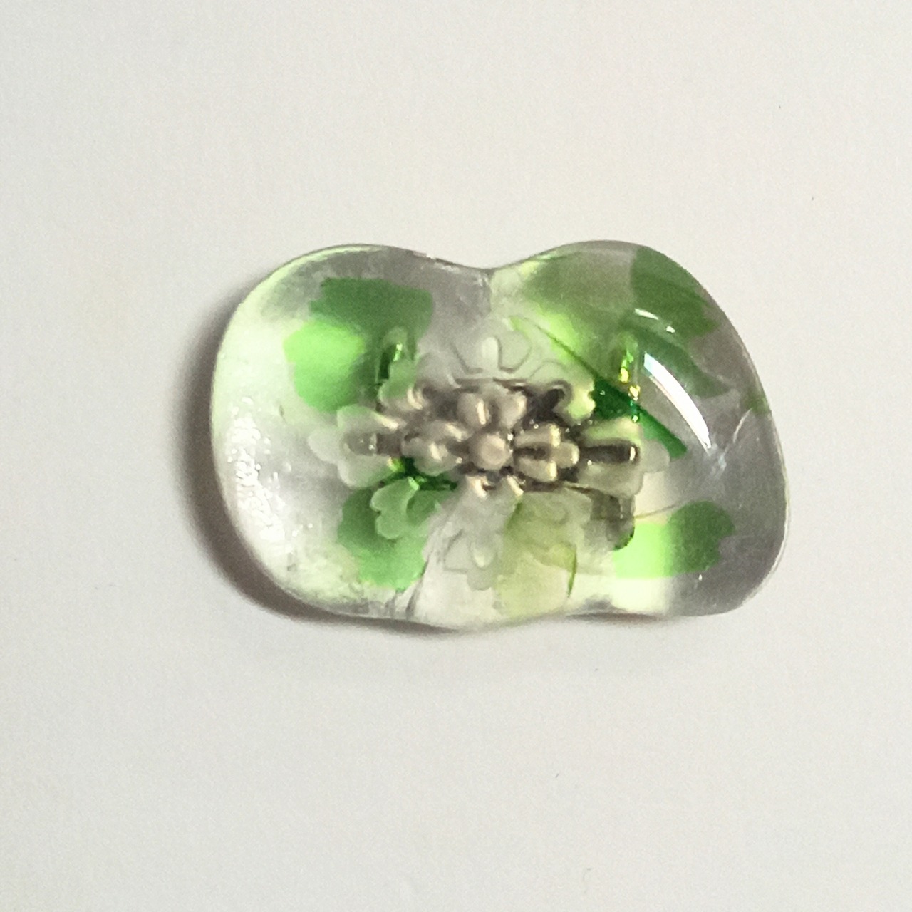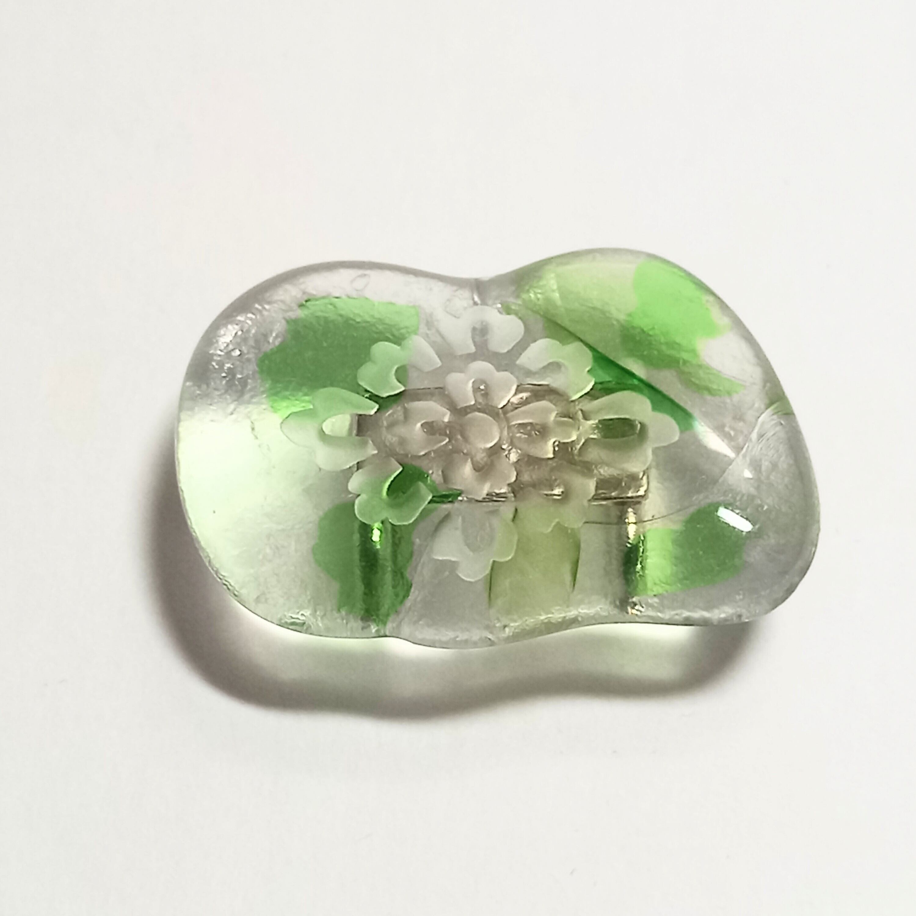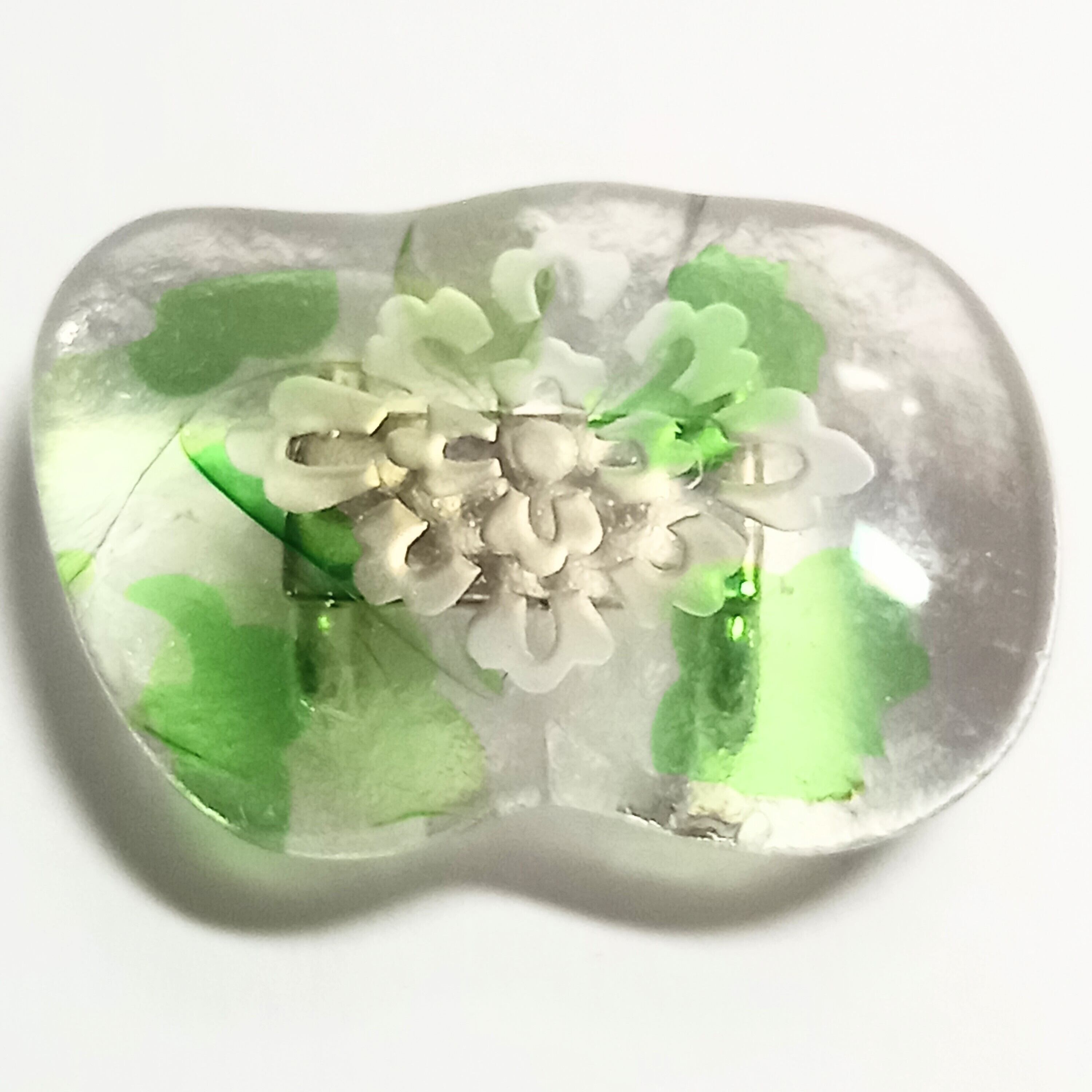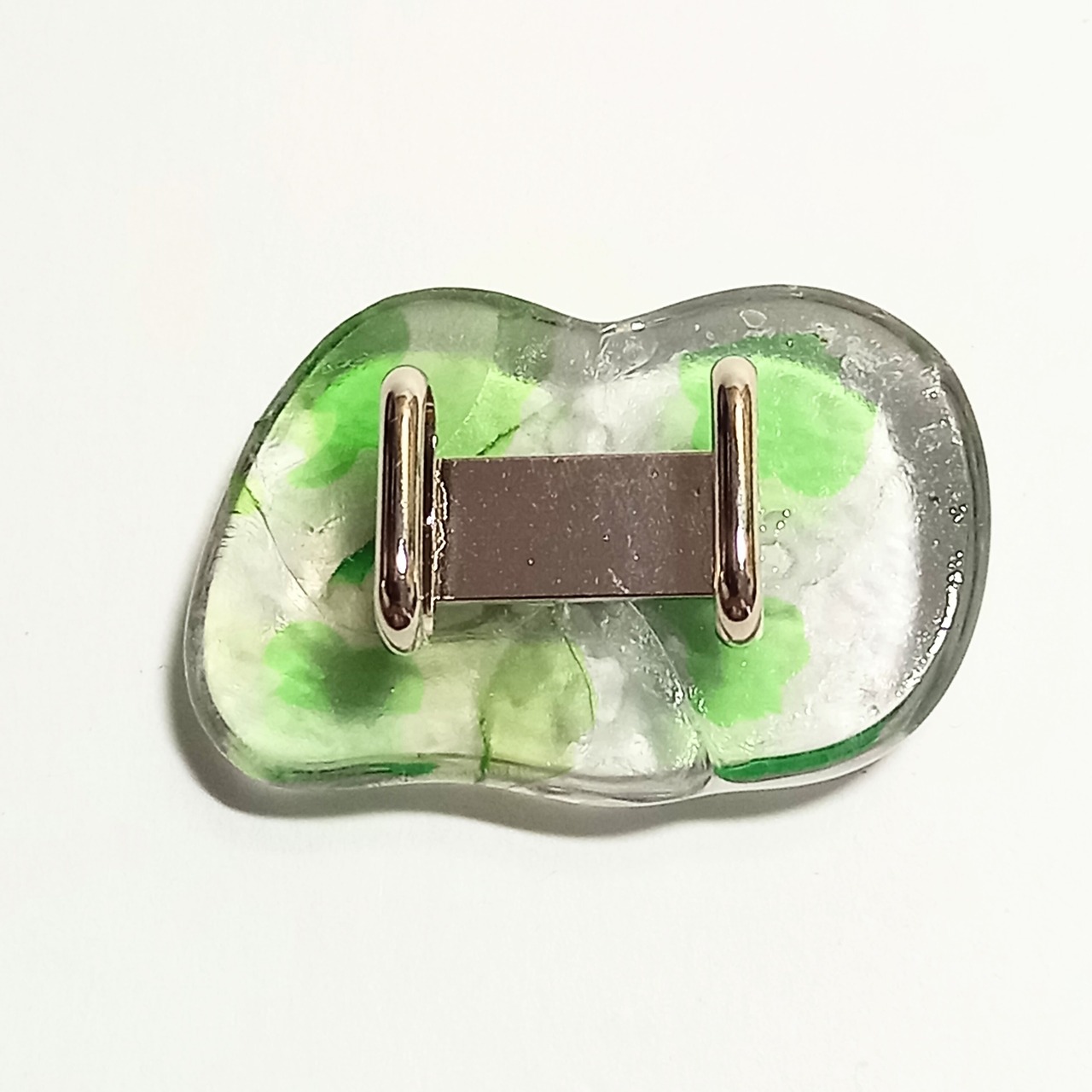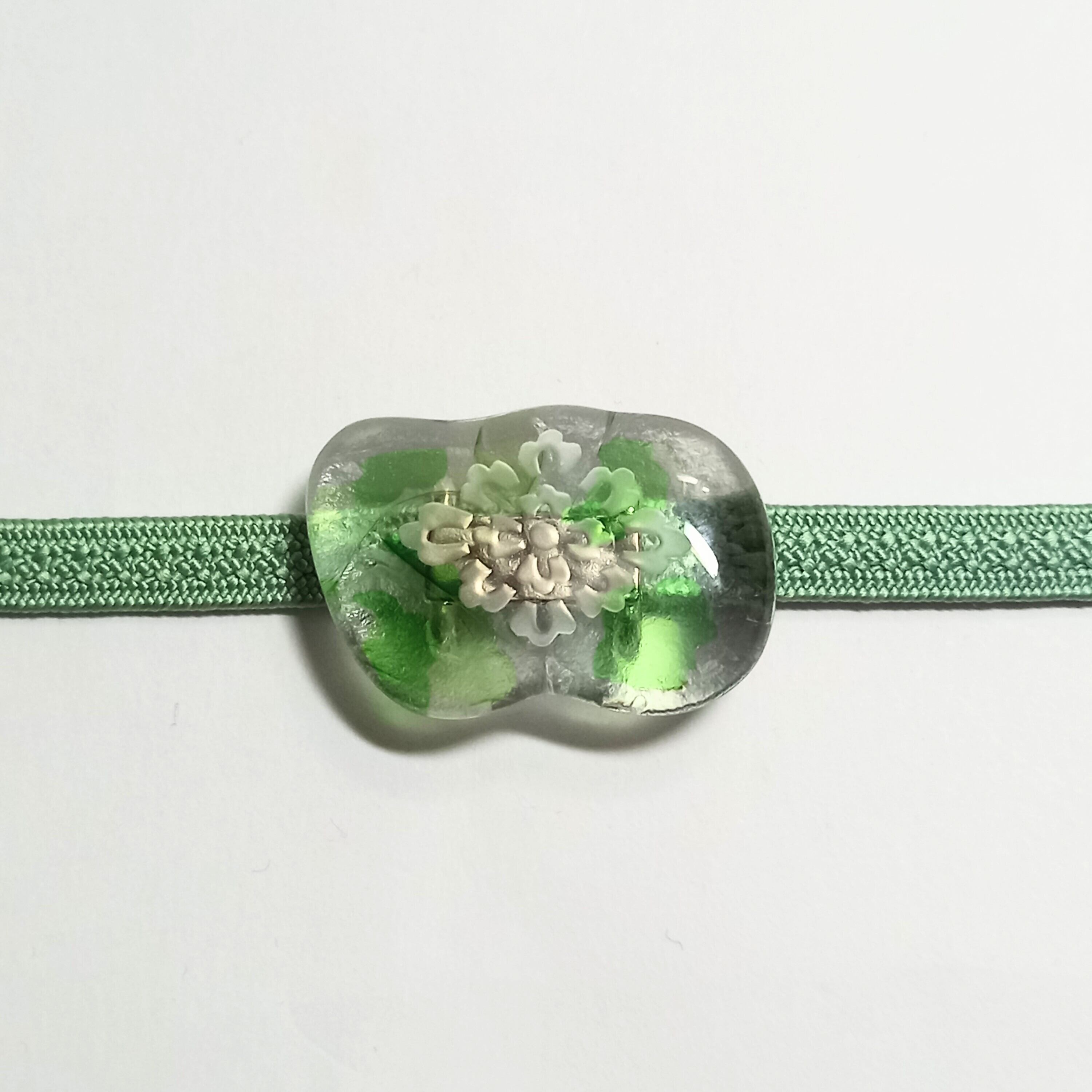 揺らぎのあるガラスの模様と花菱の古典柄がニュアンスを出しています。夏の涼しげな雰囲気に合わせるもよし、あえて氷を表して冬に着けるもよしです。
