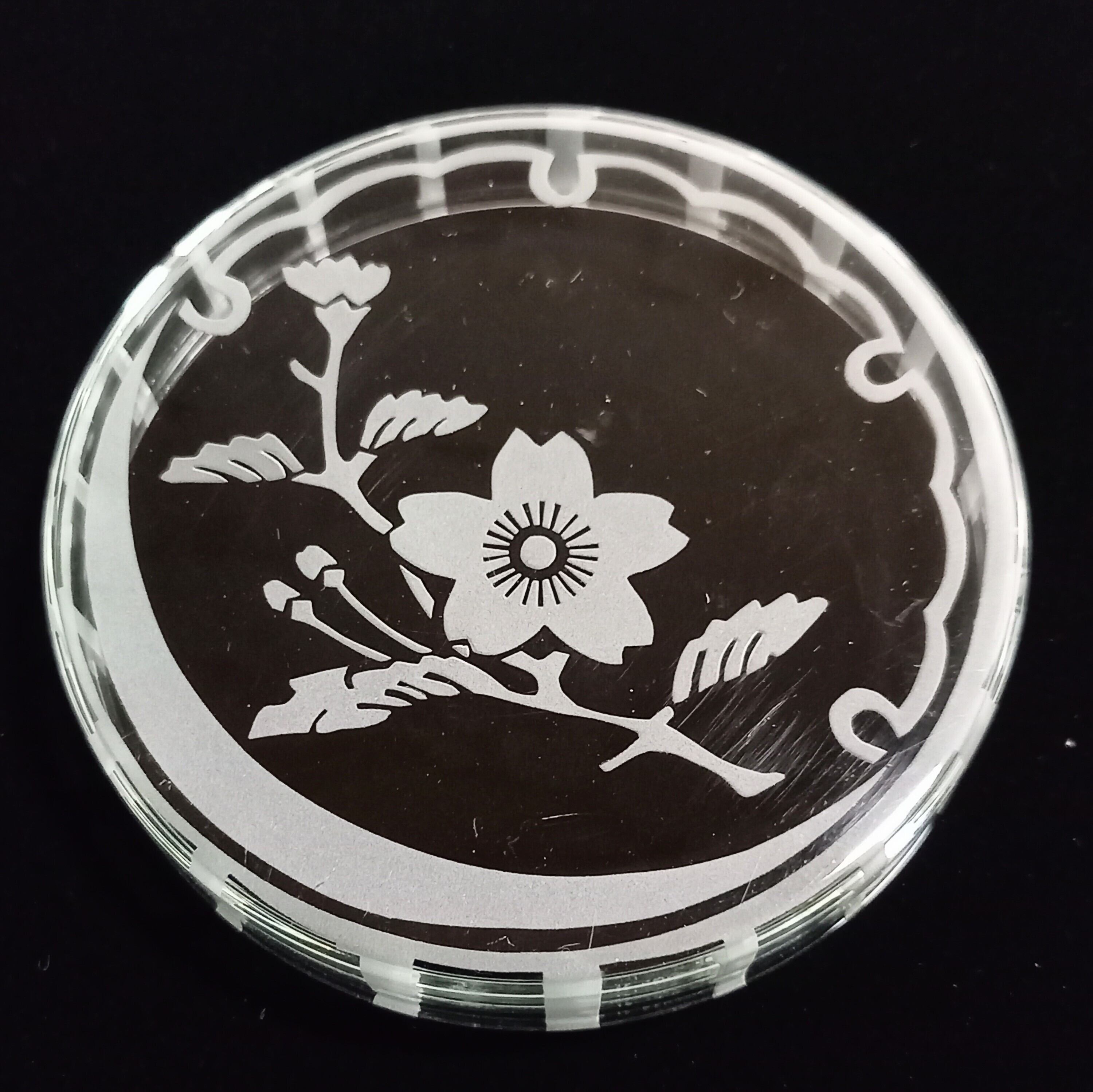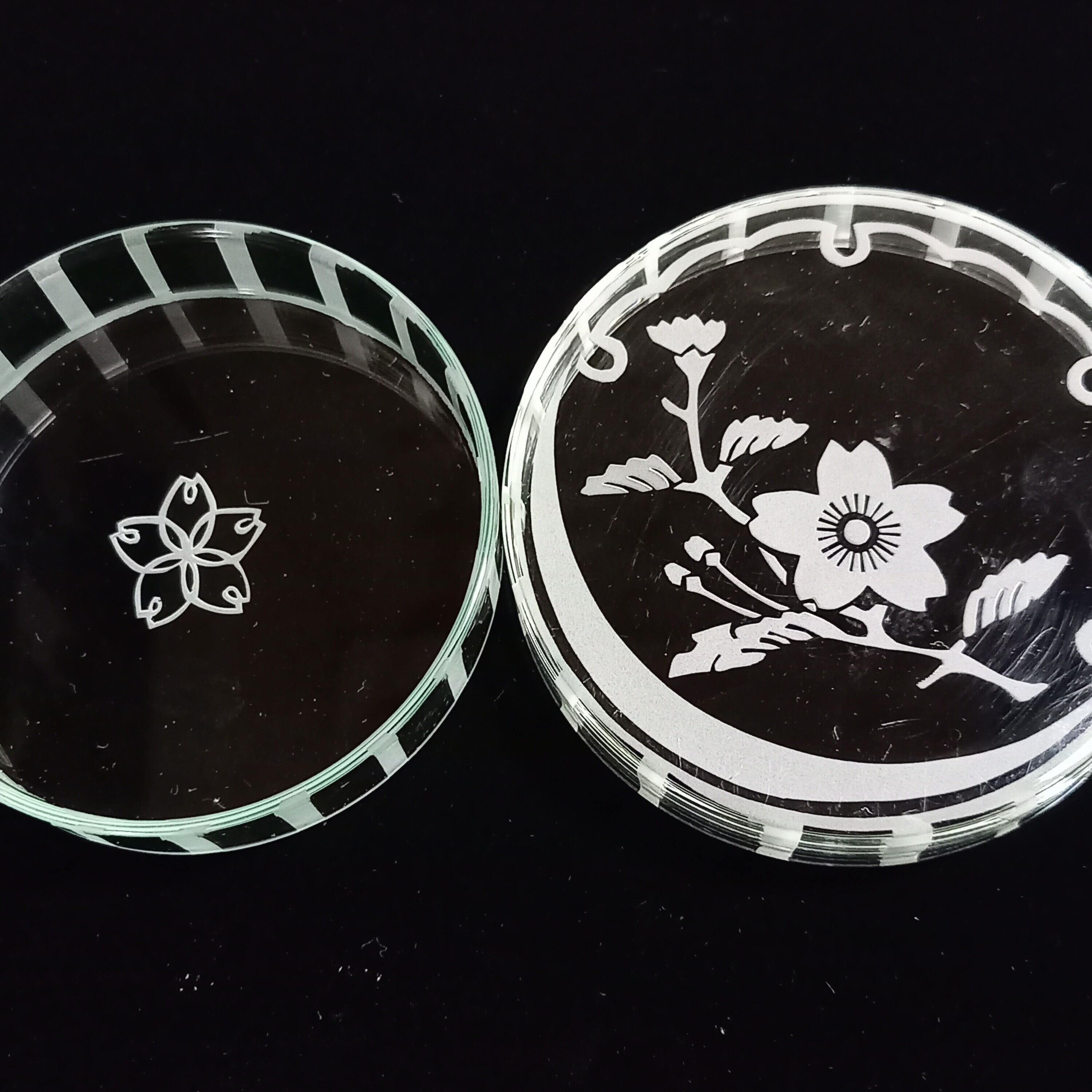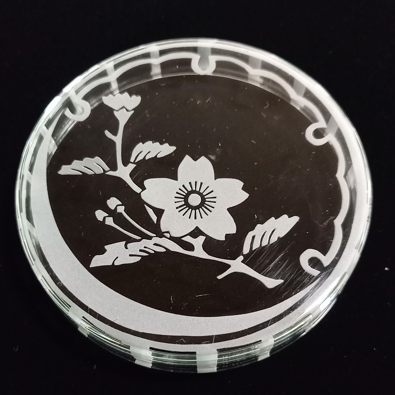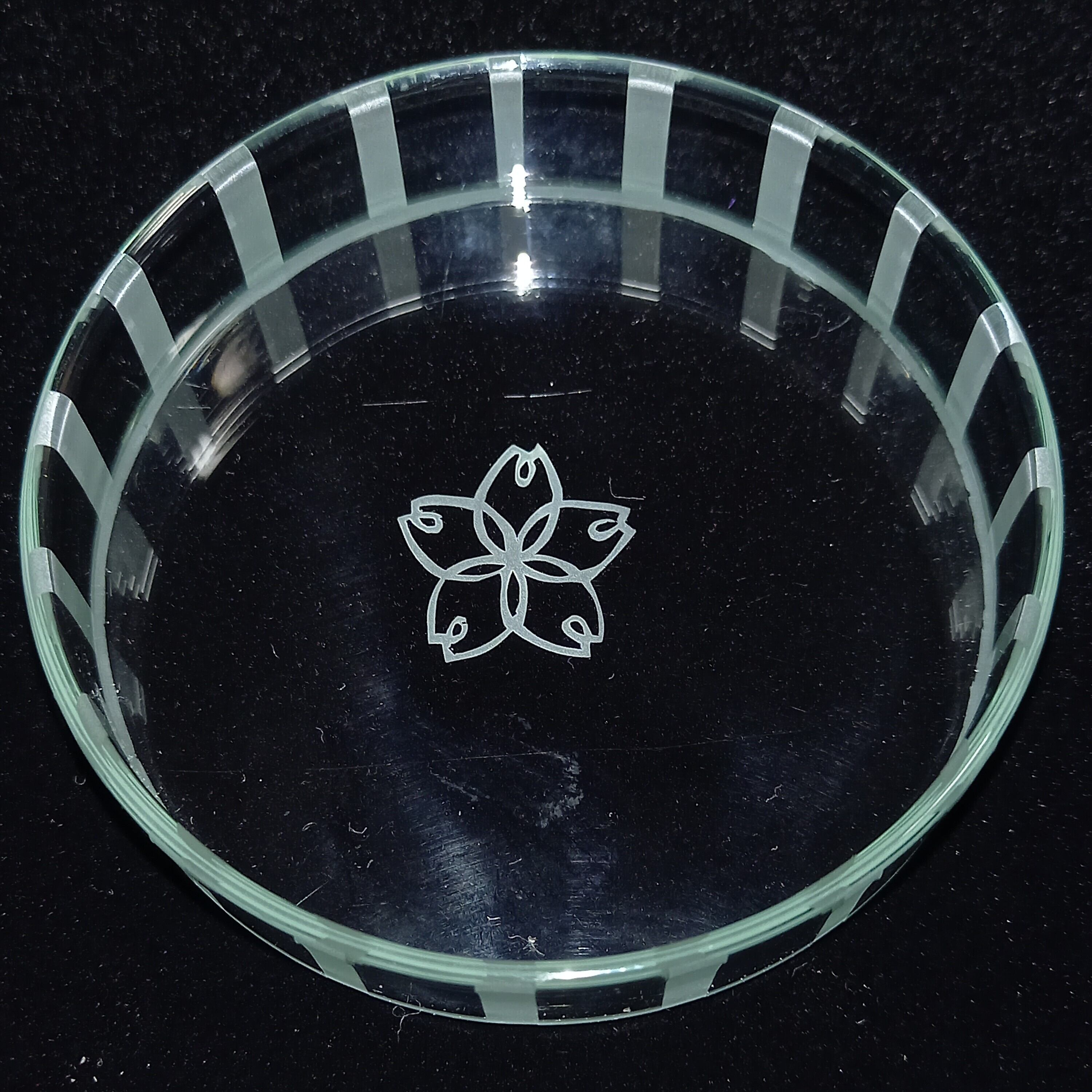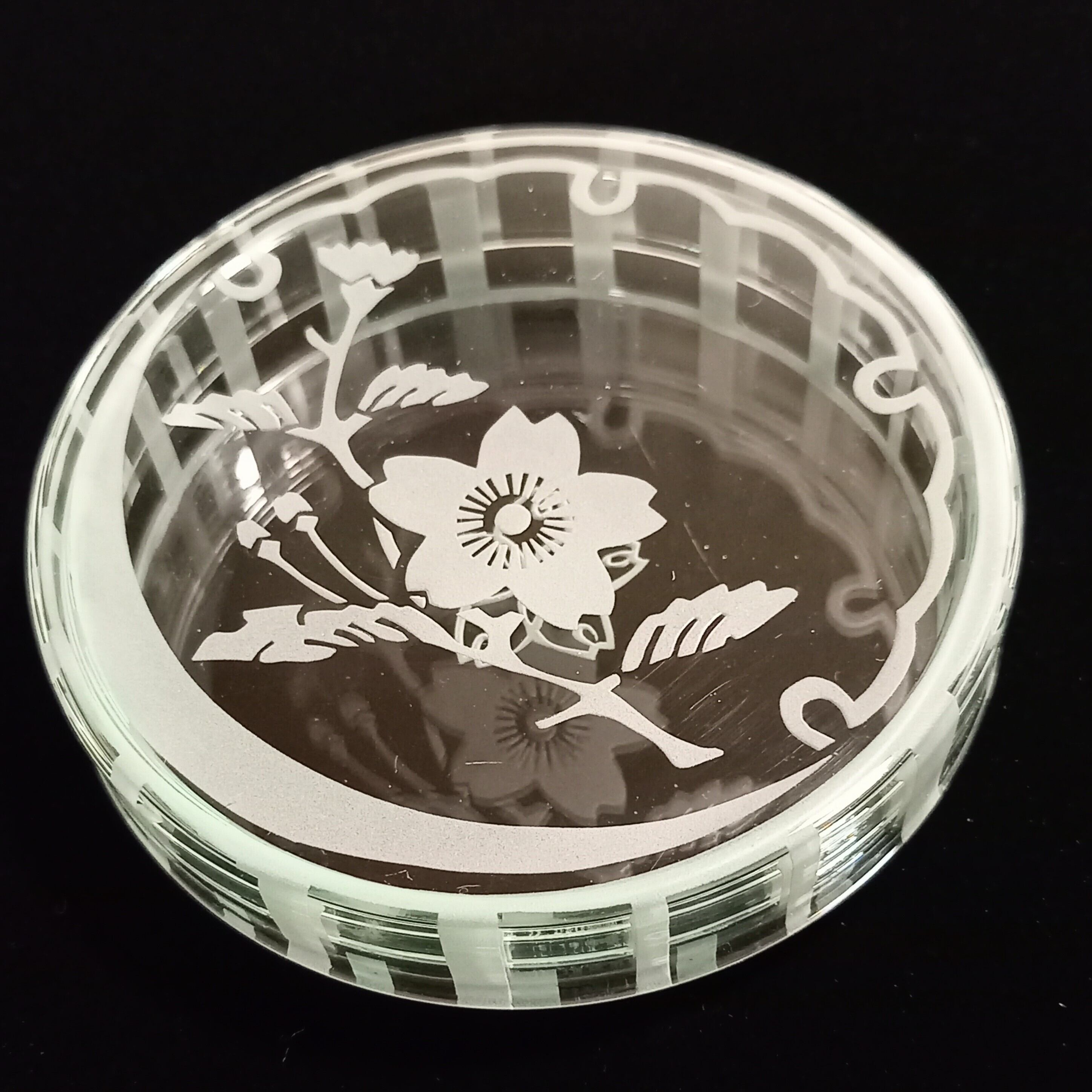 シャーレに雪月花の紋様を彫り、小物入れにしました。蓋の花は桜。底にも桜紋、側面には縞の模様が彫られています。