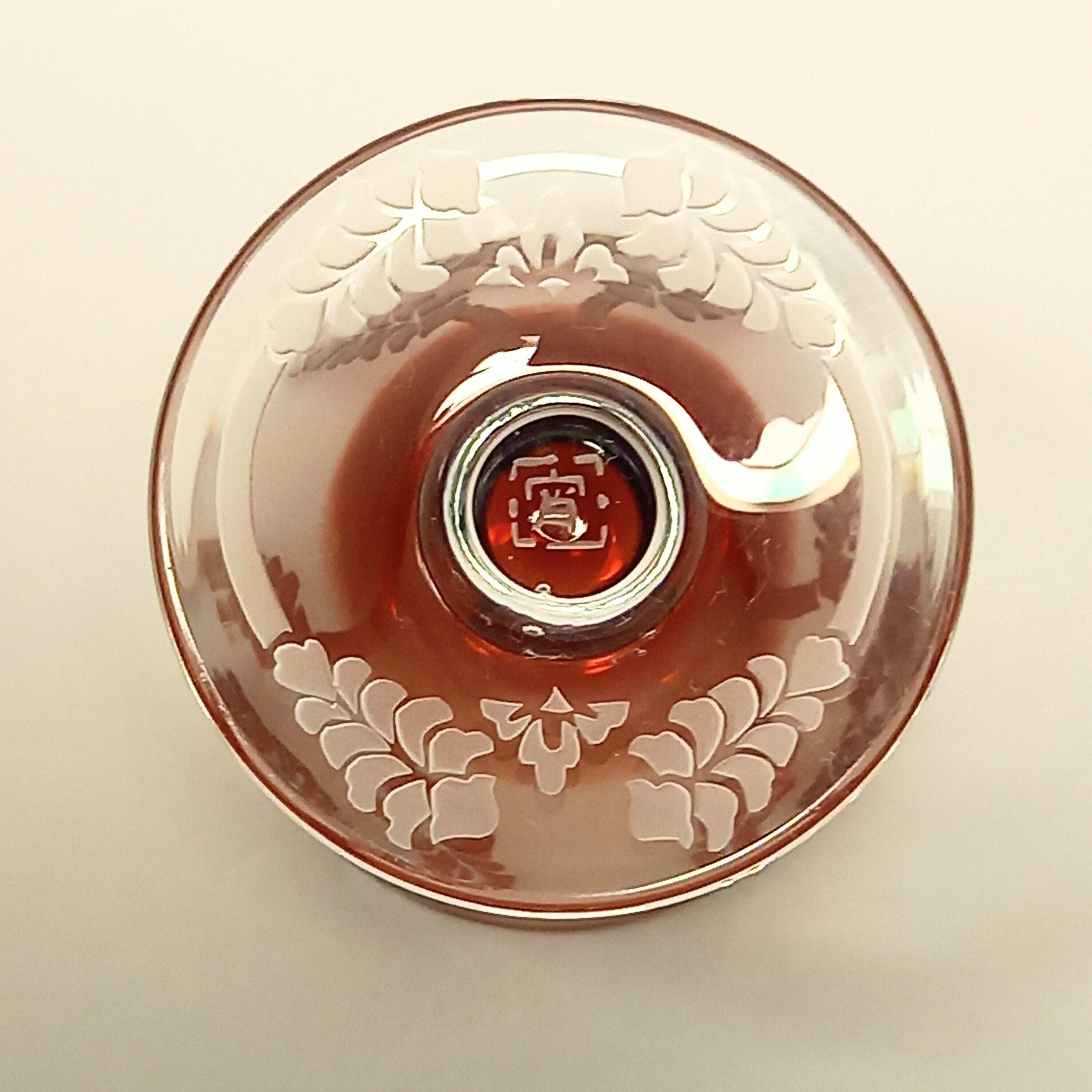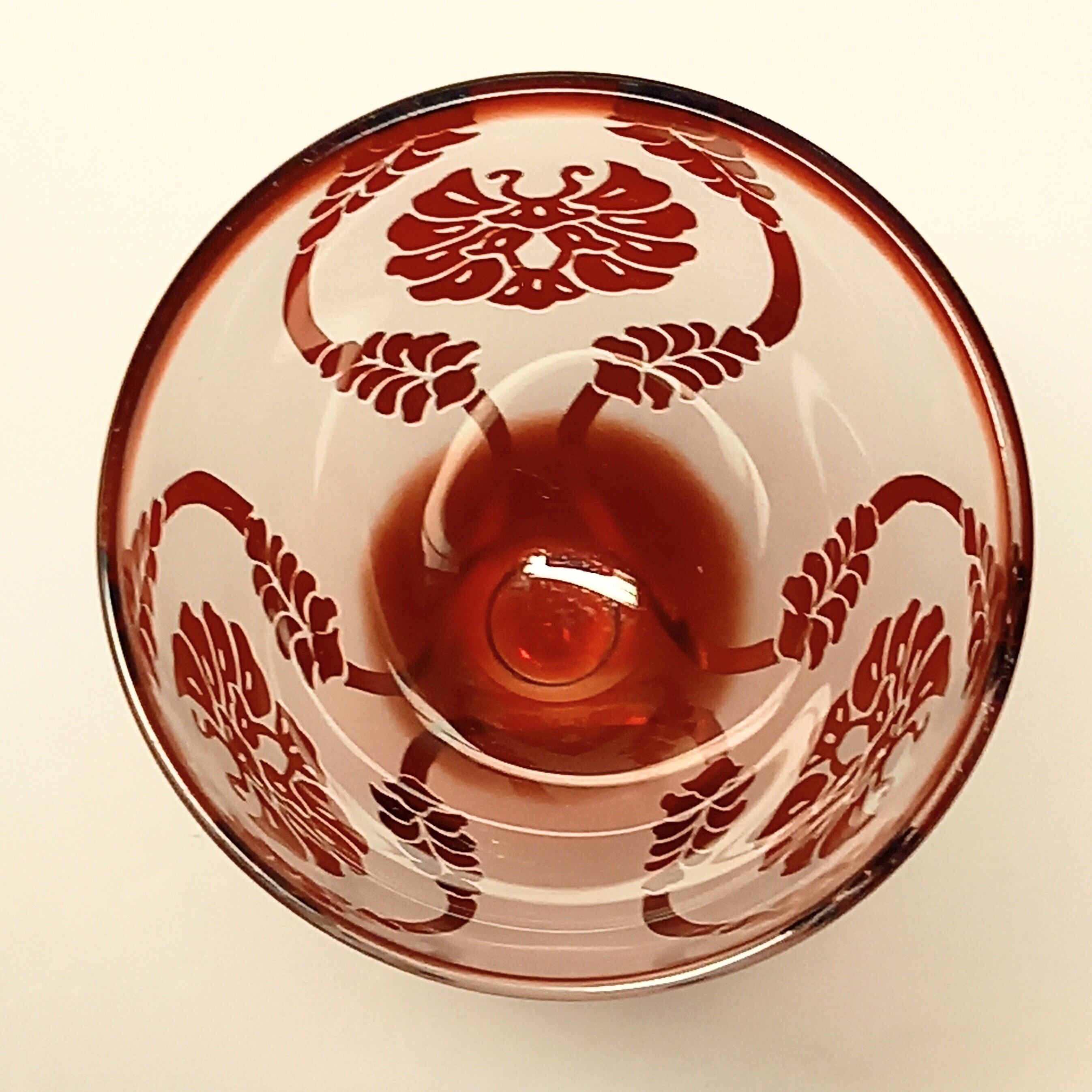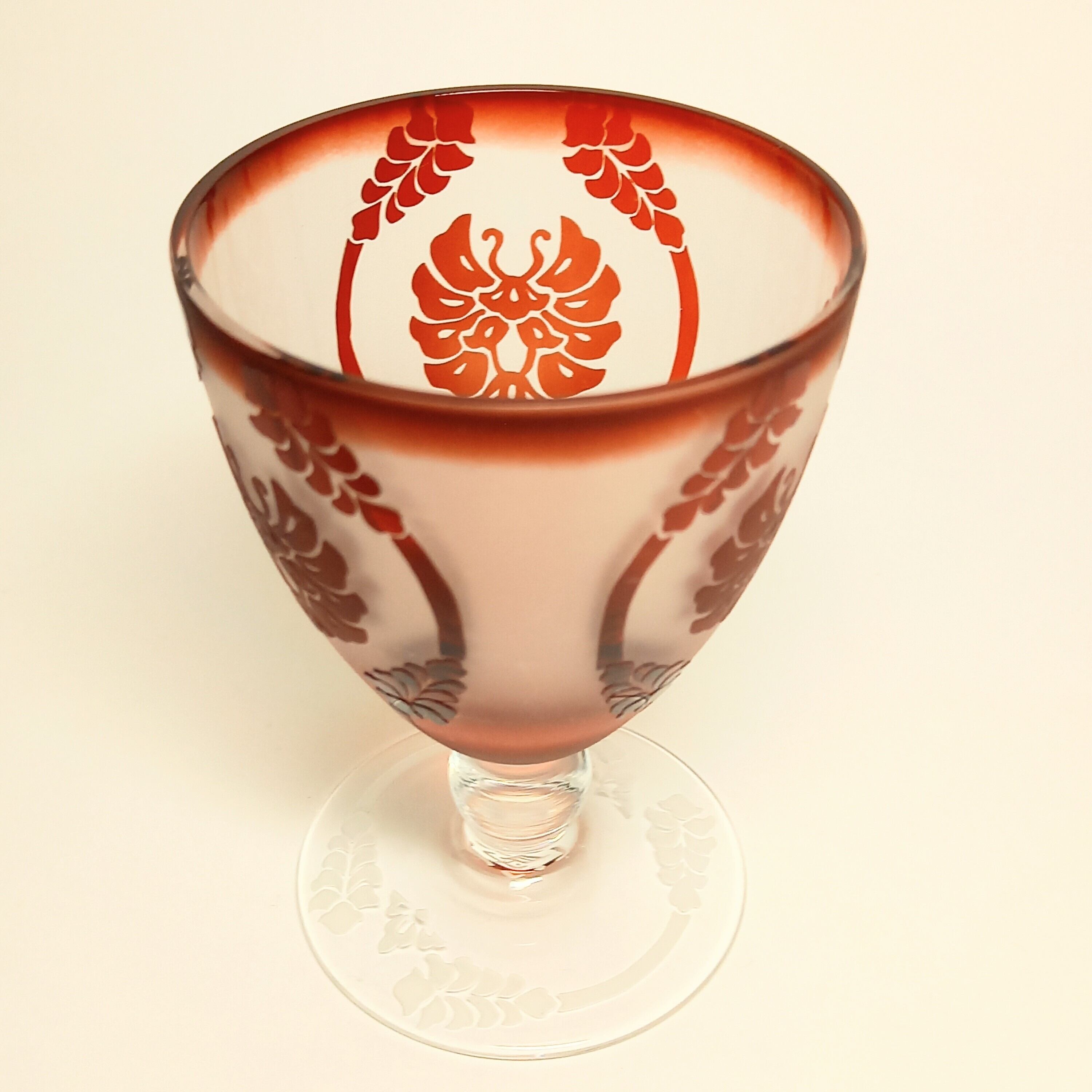 ステムのところが丸いガラス玉になっている、可愛いグラスです。紋様は有職紋の唐花立涌紋をアレンジしたデザイン。蝶のような紋様は艶消し加工になっています。