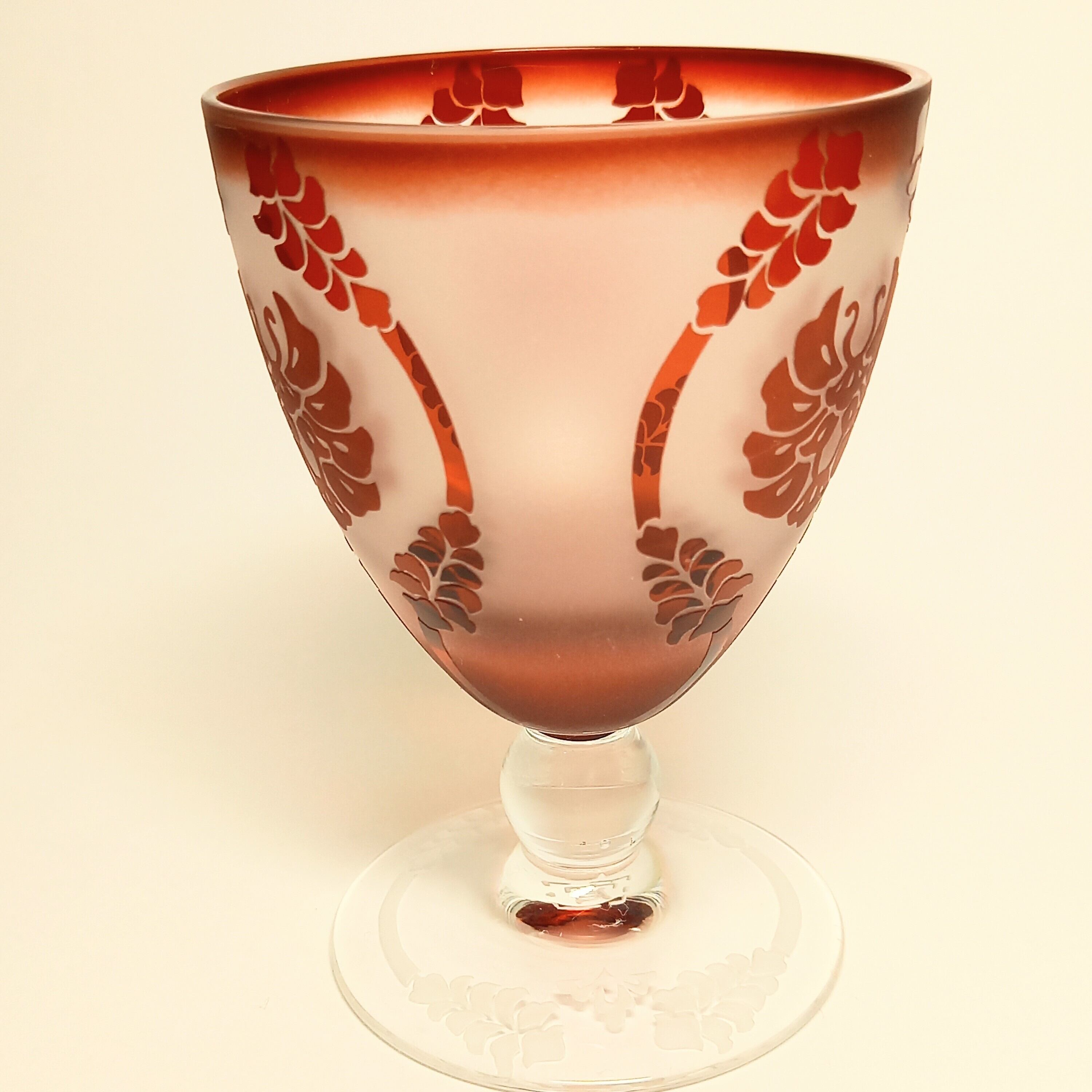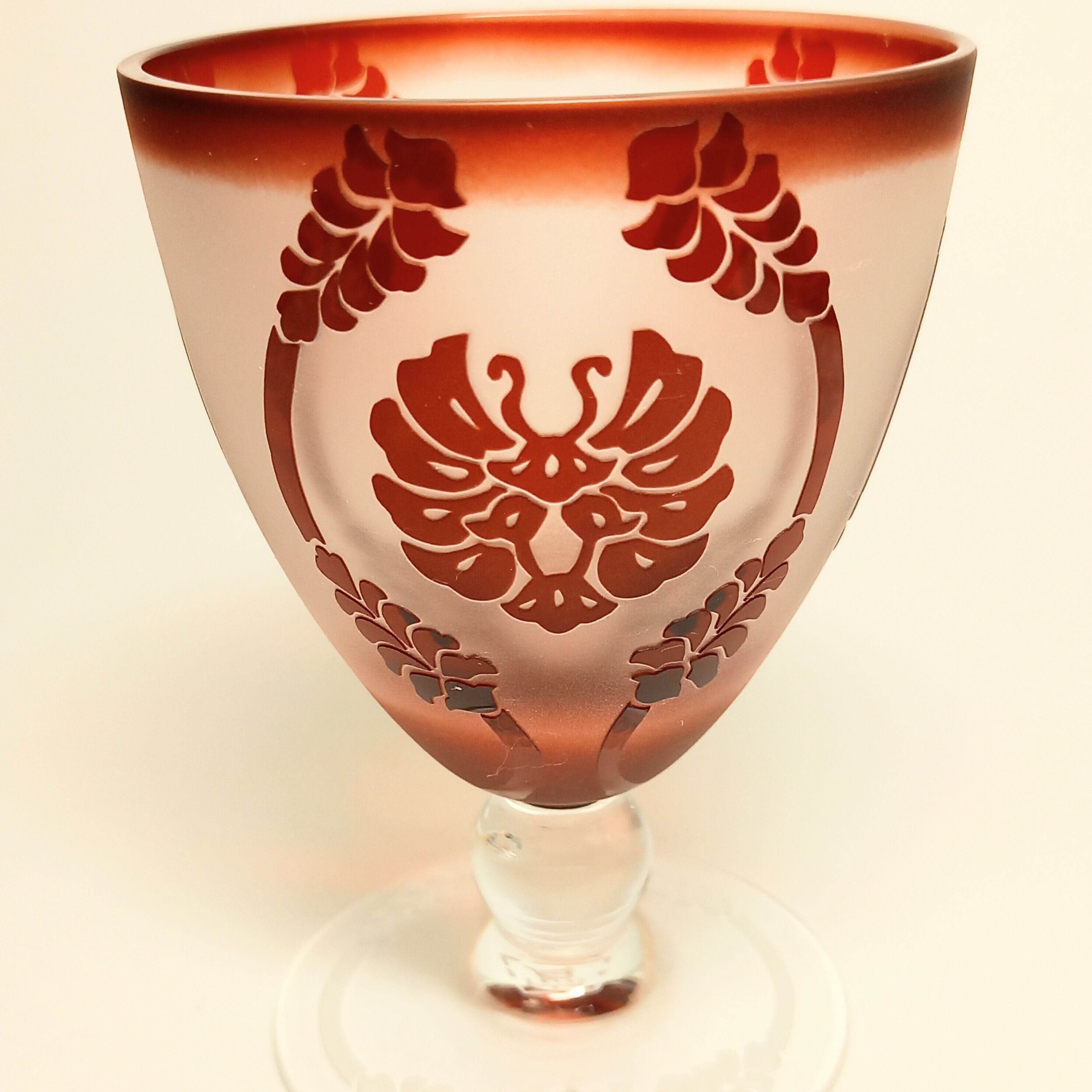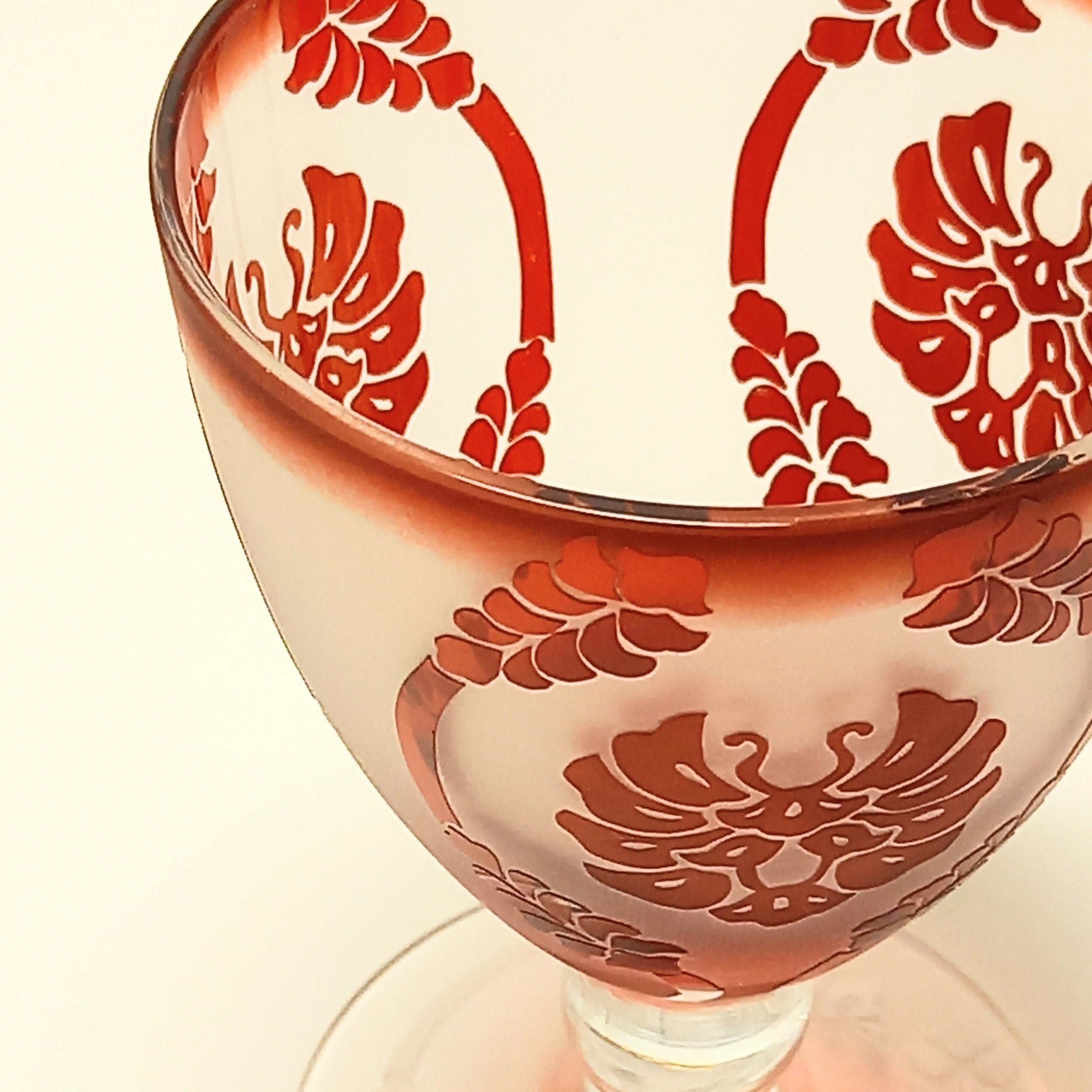 ステムのところが丸いガラス玉になっている、可愛いグラスです。紋様は有職紋の唐花立涌紋をアレンジしたデザイン。蝶のような紋様は艶消し加工になっています。