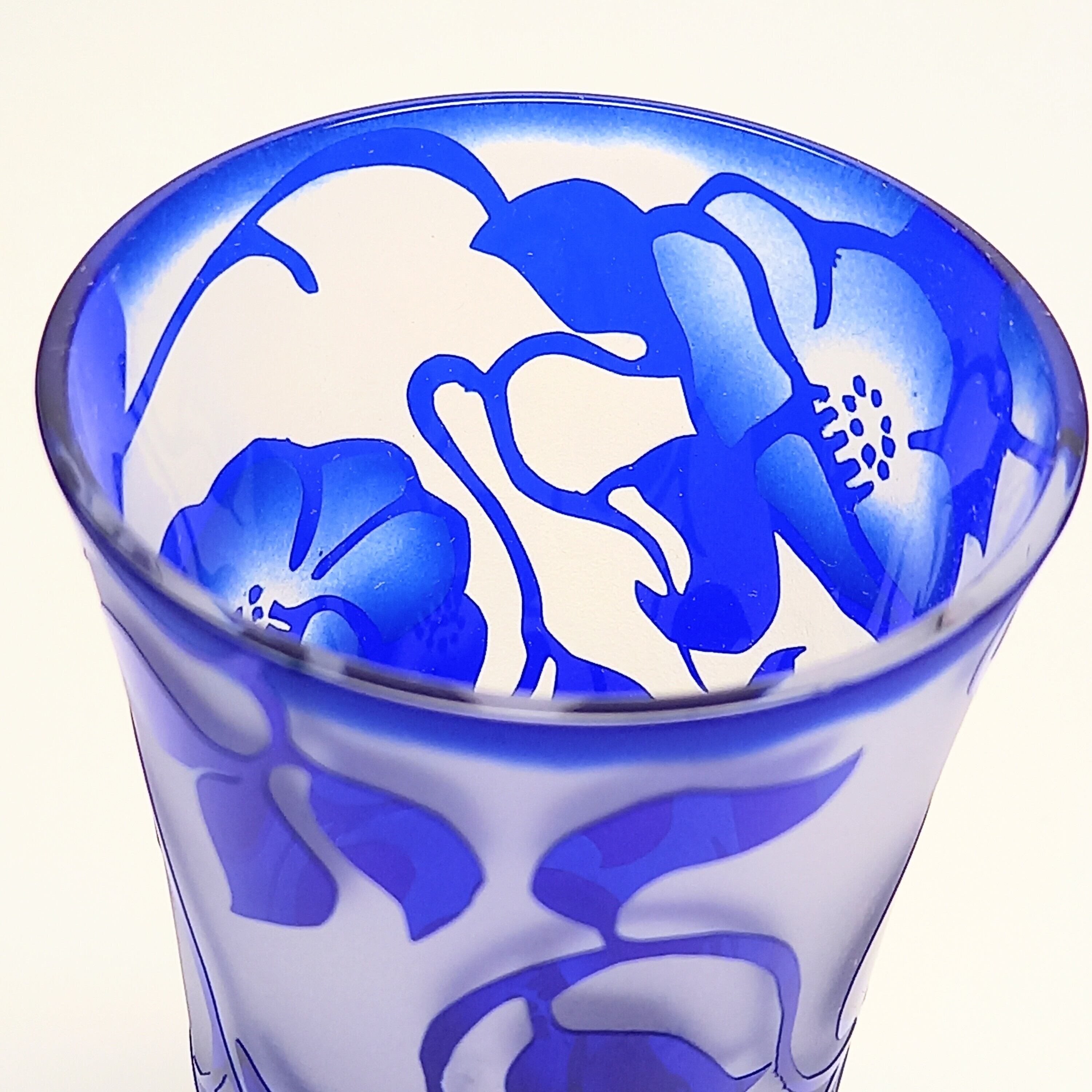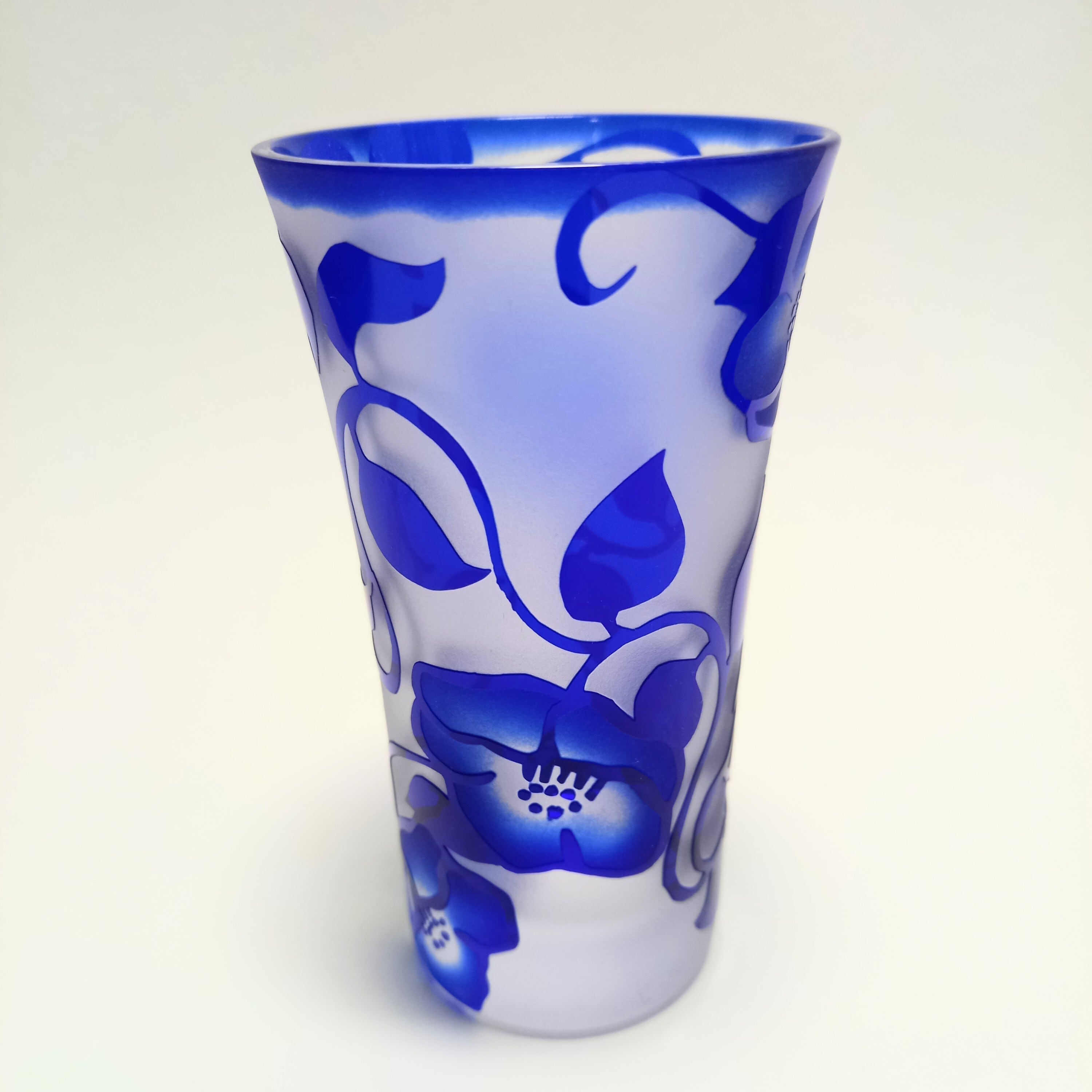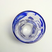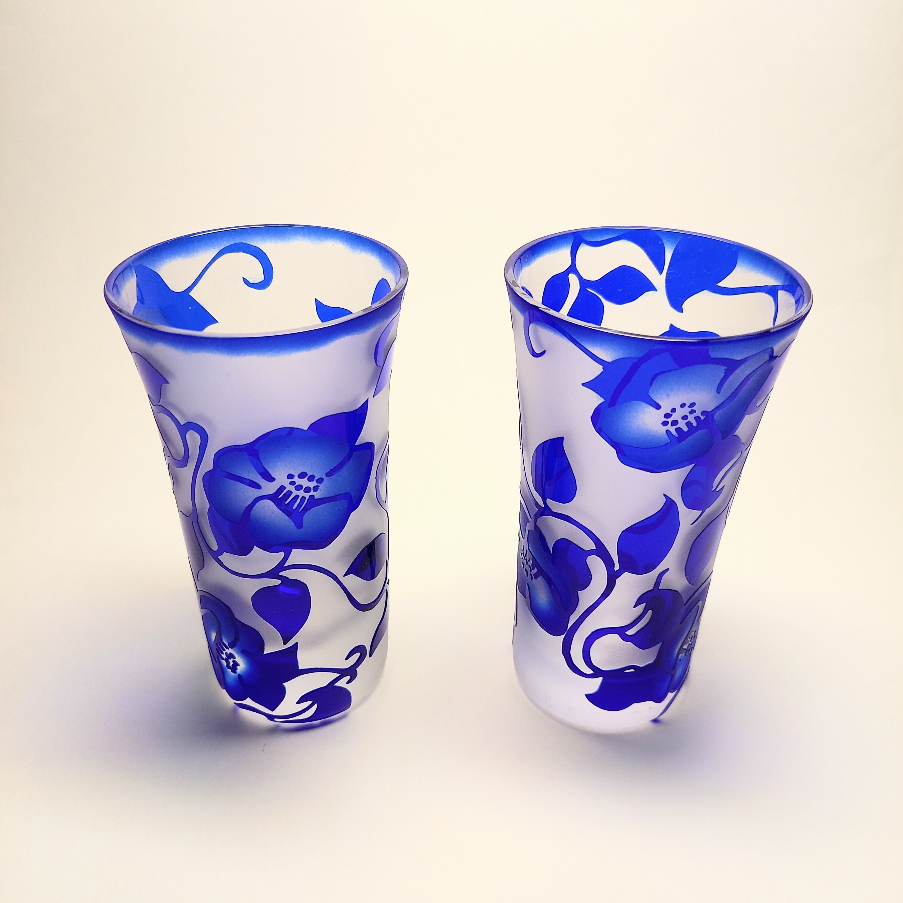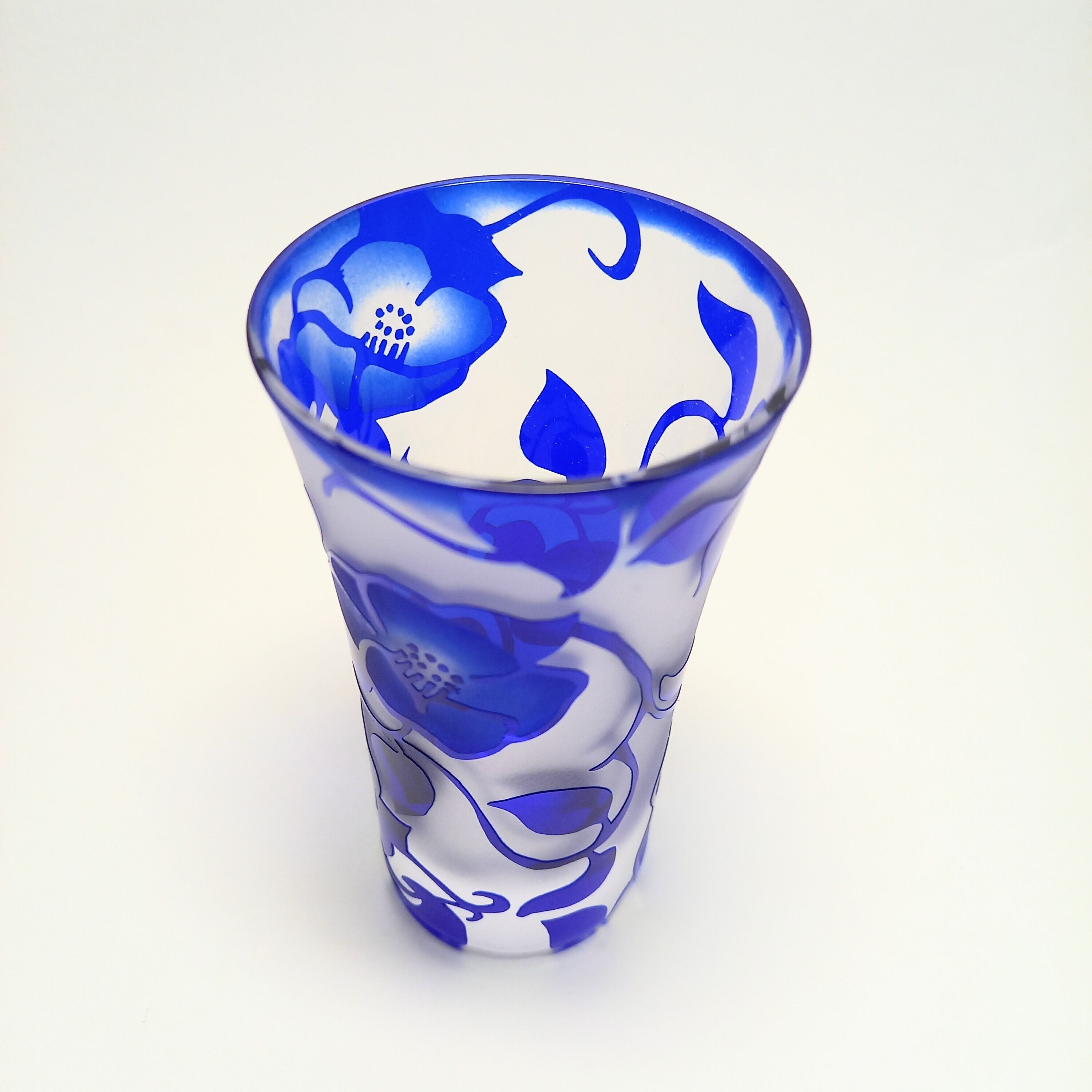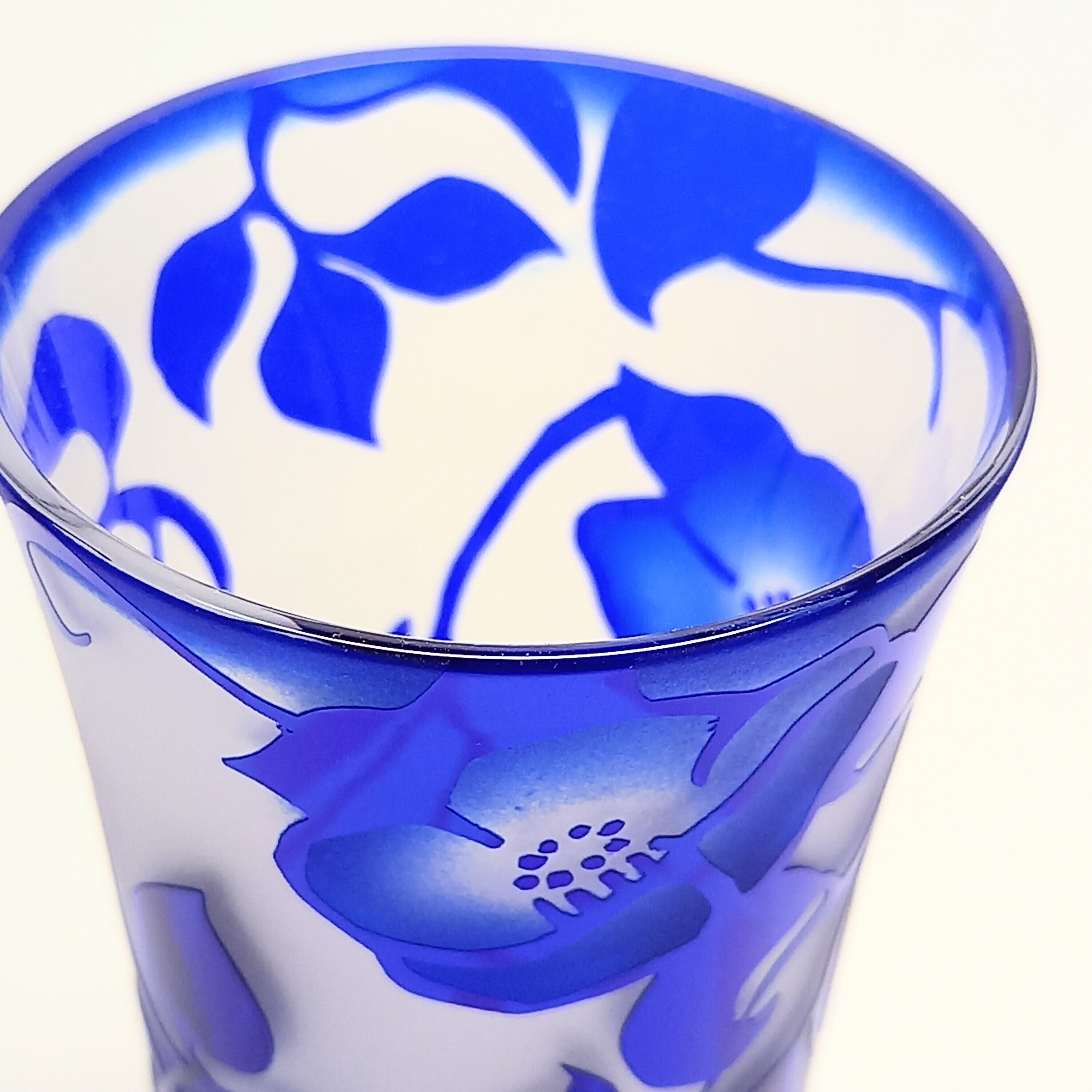 定番の椿唐草紋様を瑠璃色の1口ビアグラスに彫りました。花の中は暈してコントラストを出しています。