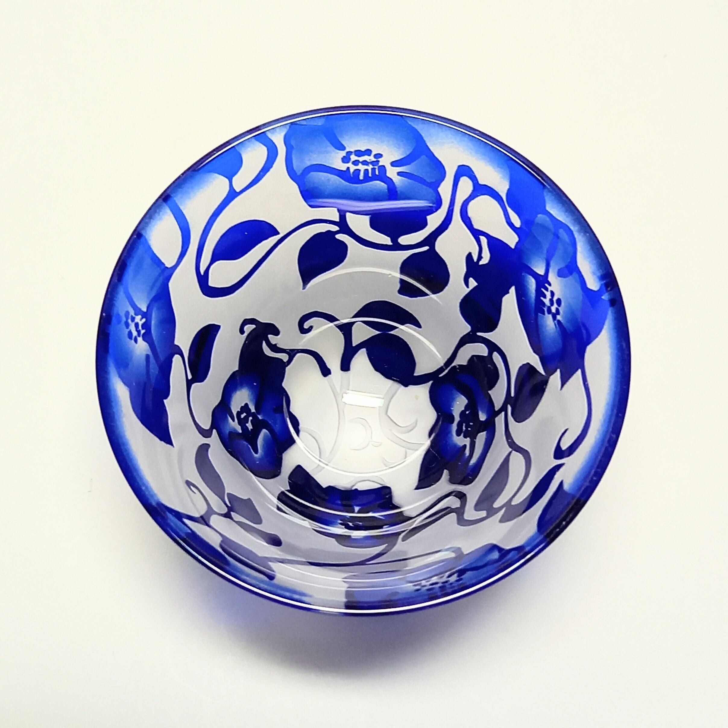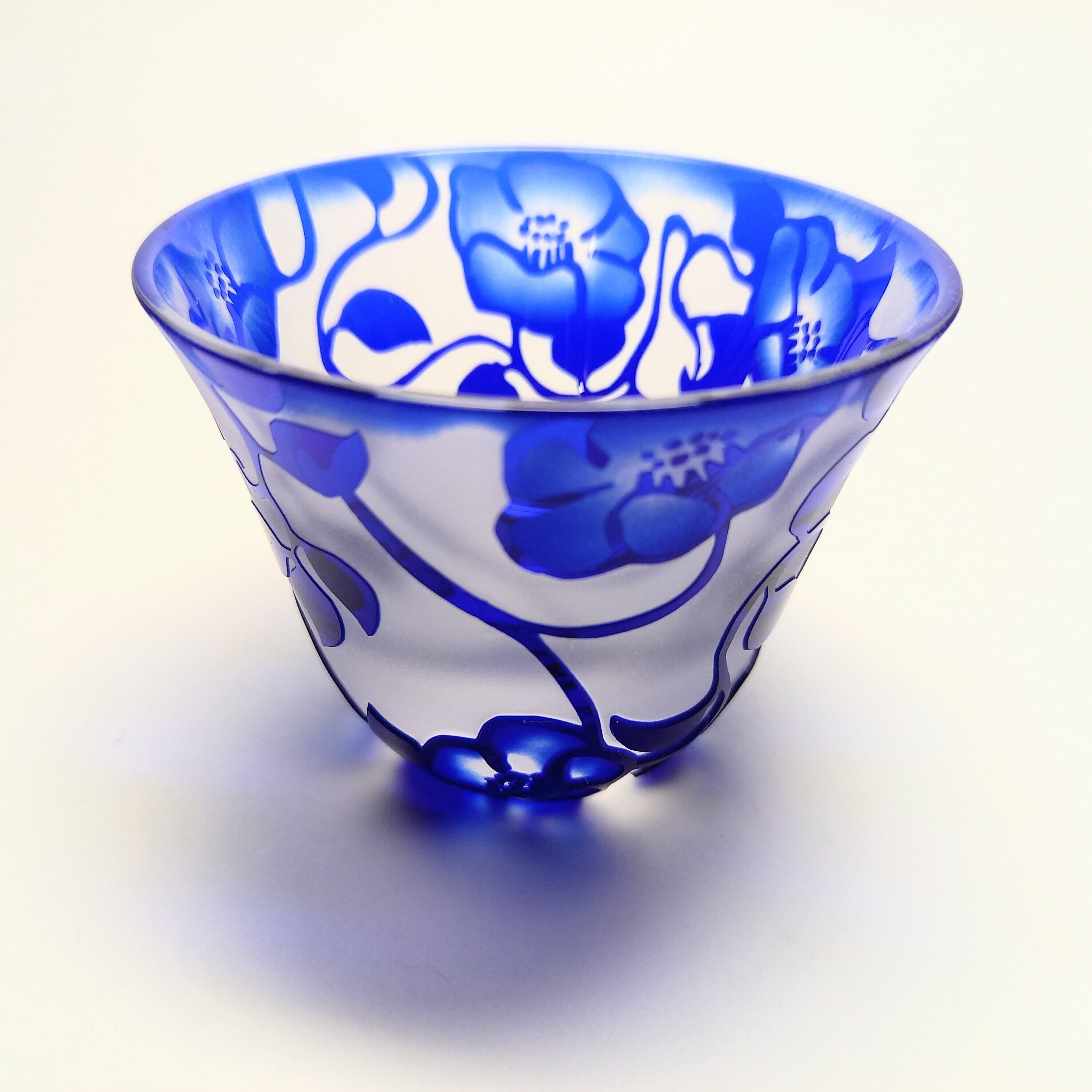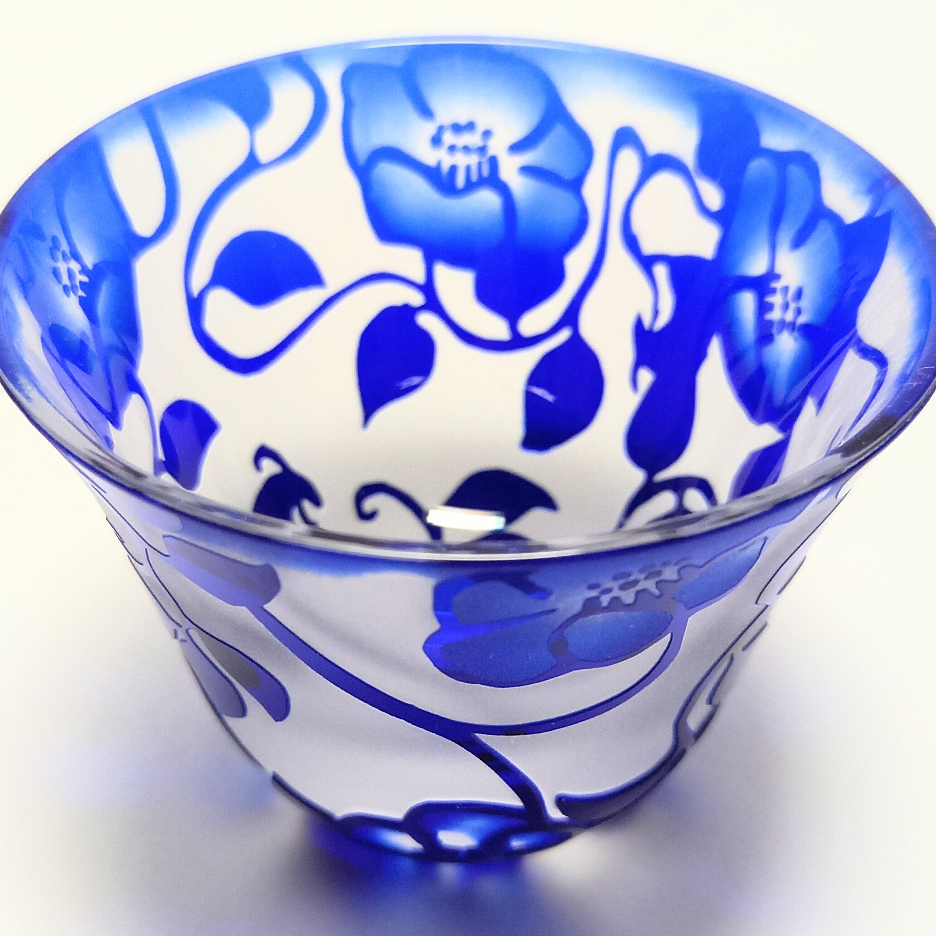 定番の椿唐草紋様を瑠璃色の口の開いたぐい呑みに彫りました。花の中は暈してコントラストを出しています。
