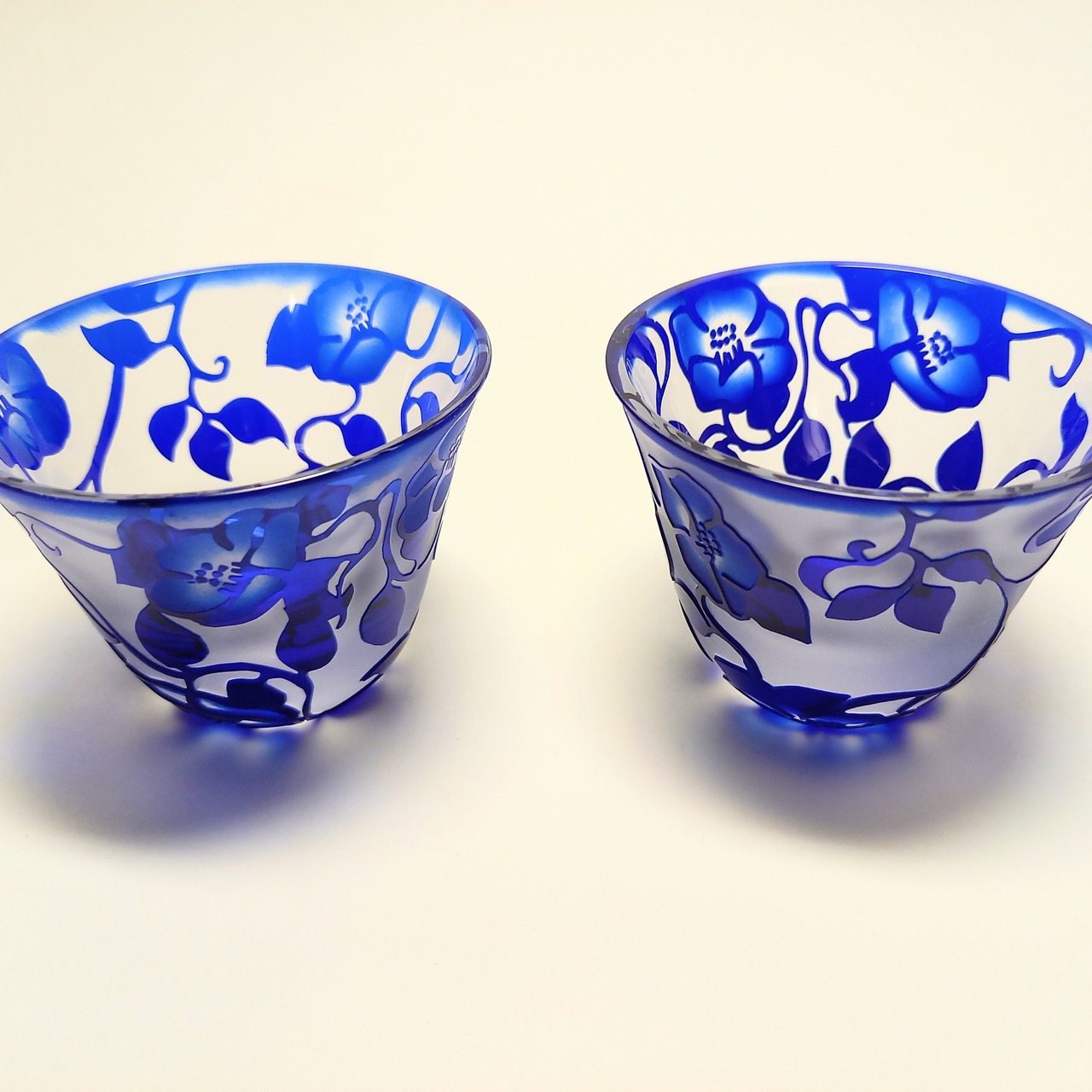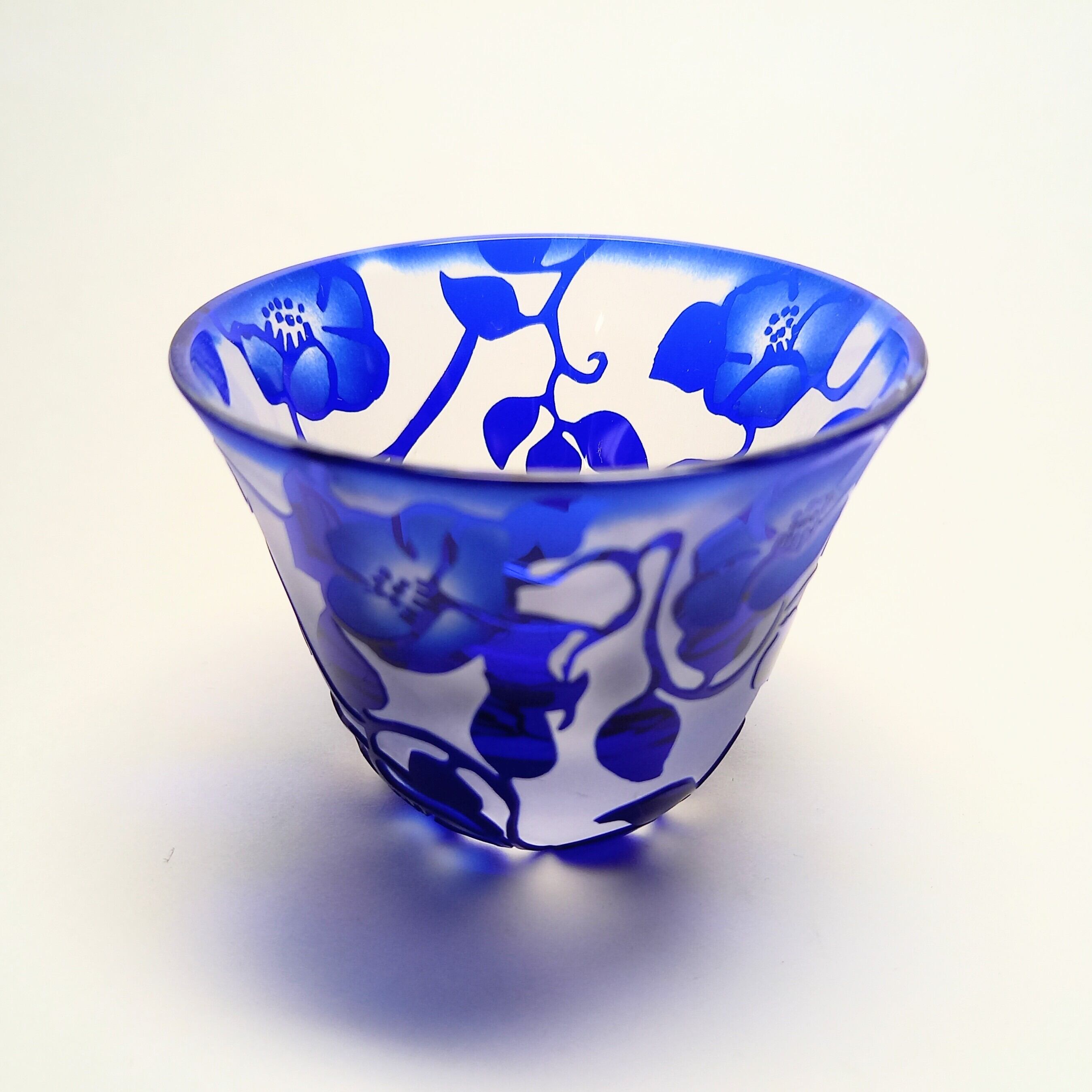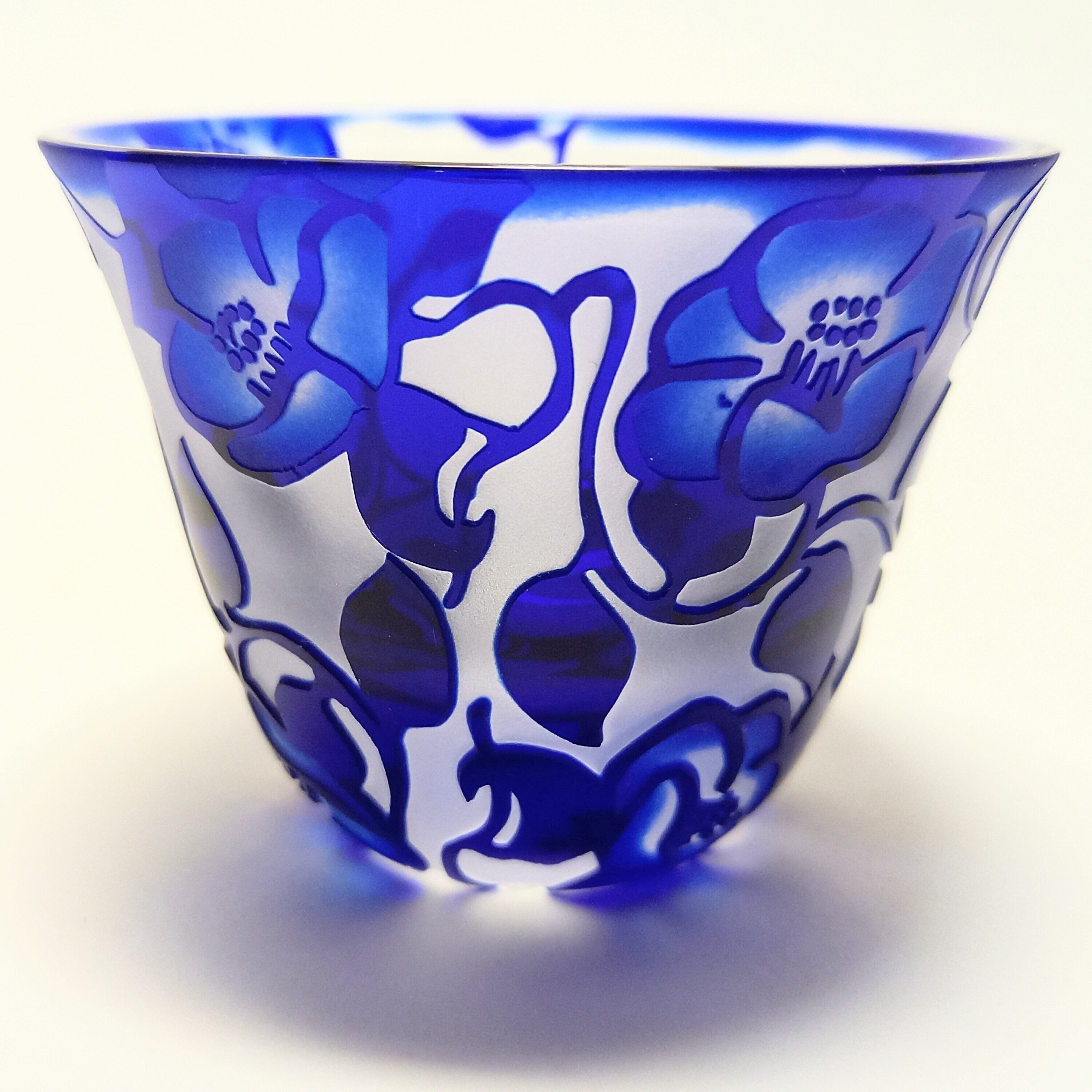 定番の椿唐草紋様を瑠璃色の口の開いたぐい呑みに彫りました。花の中は暈してコントラストを出しています。
