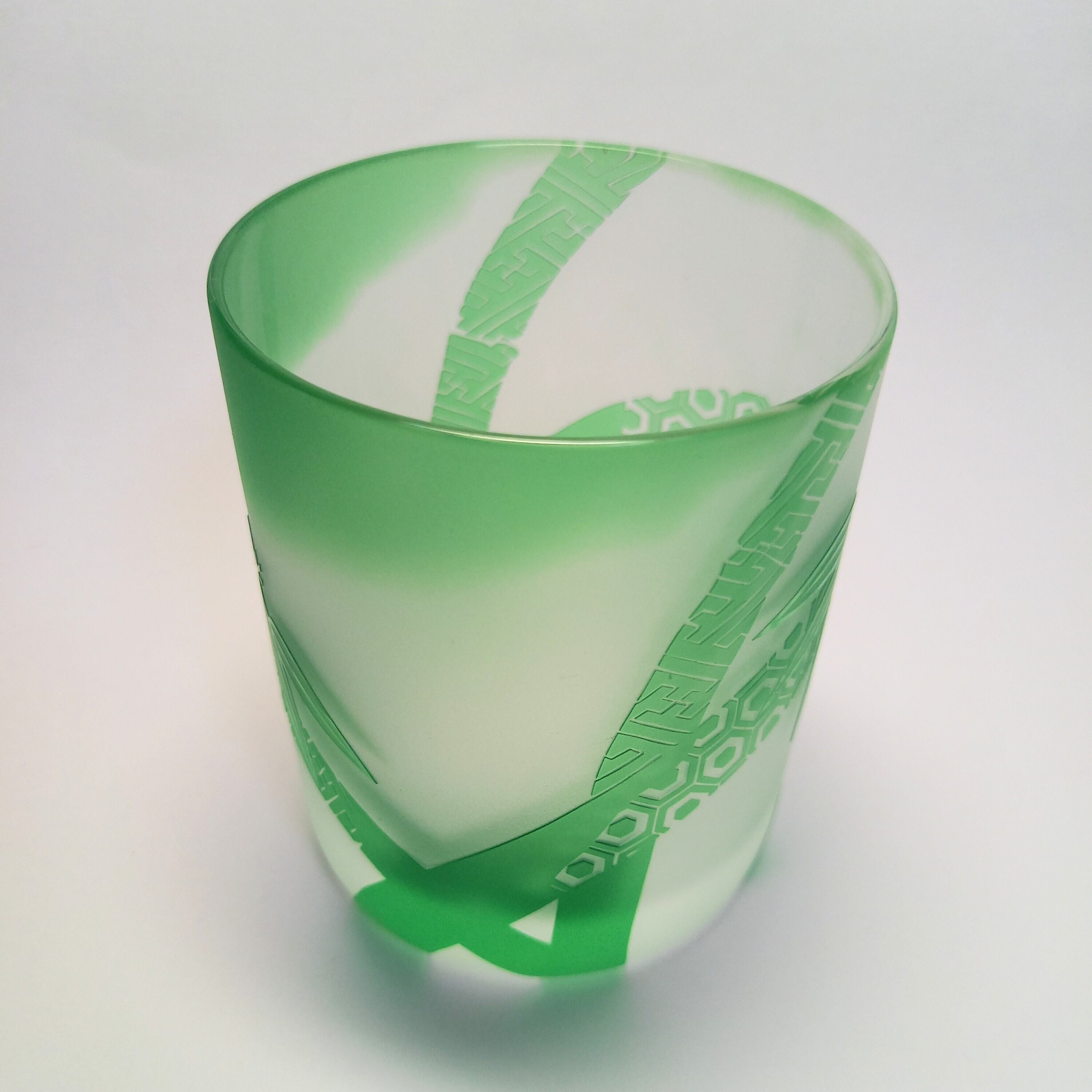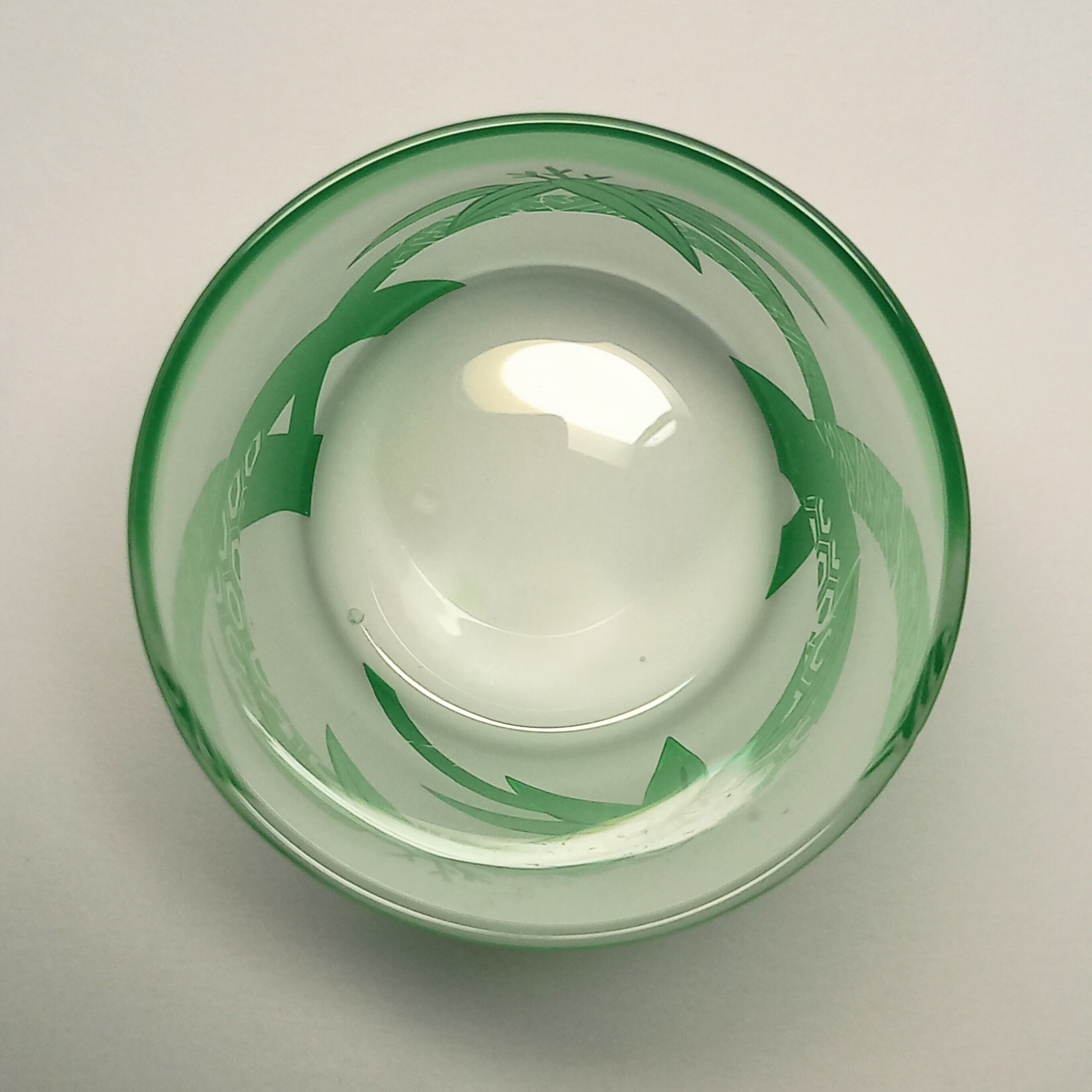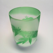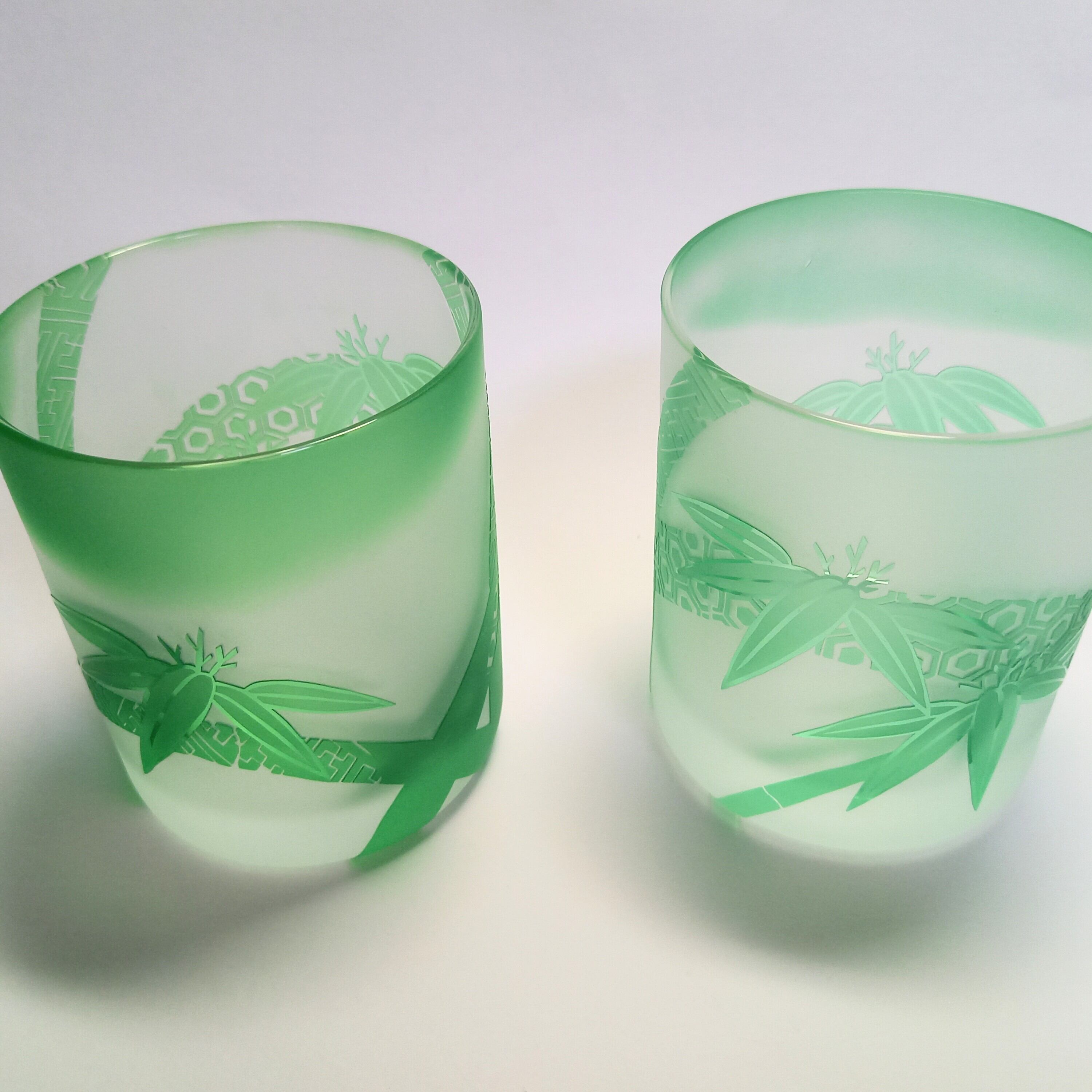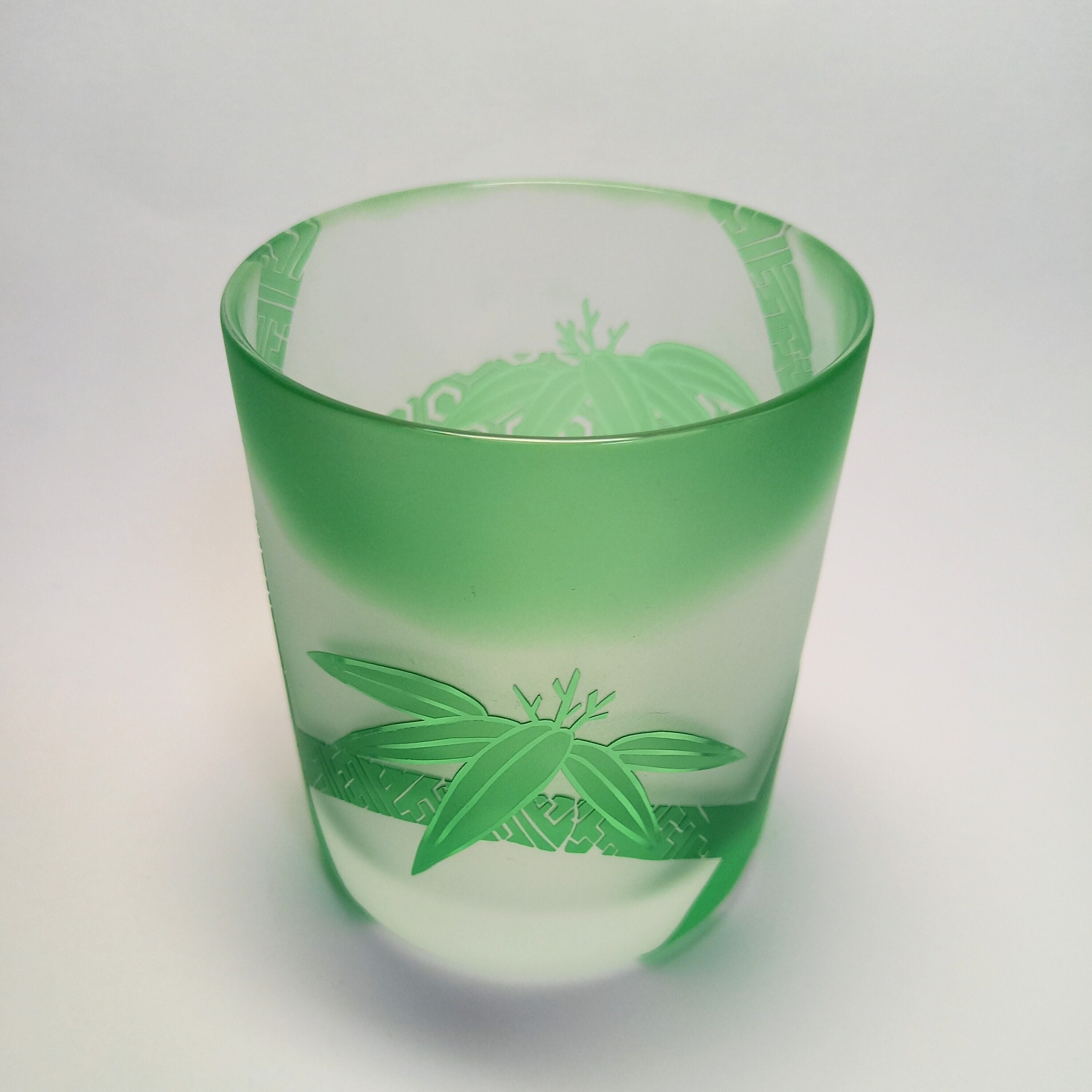 縁起の良い竹笹紋様を、緑色の被せガラスに彫りました。竹には更に縁起良く亀甲と紗綾形紋様が彫られています。