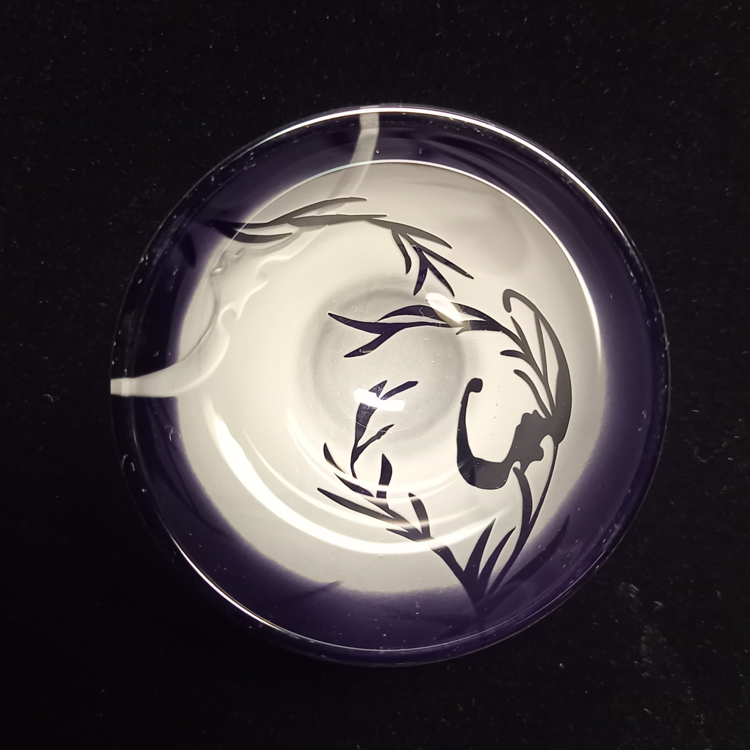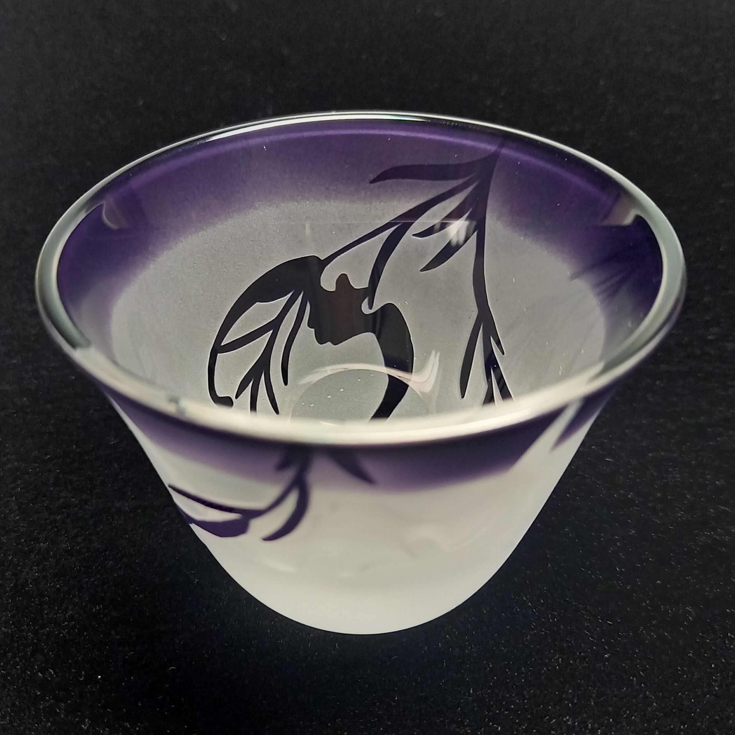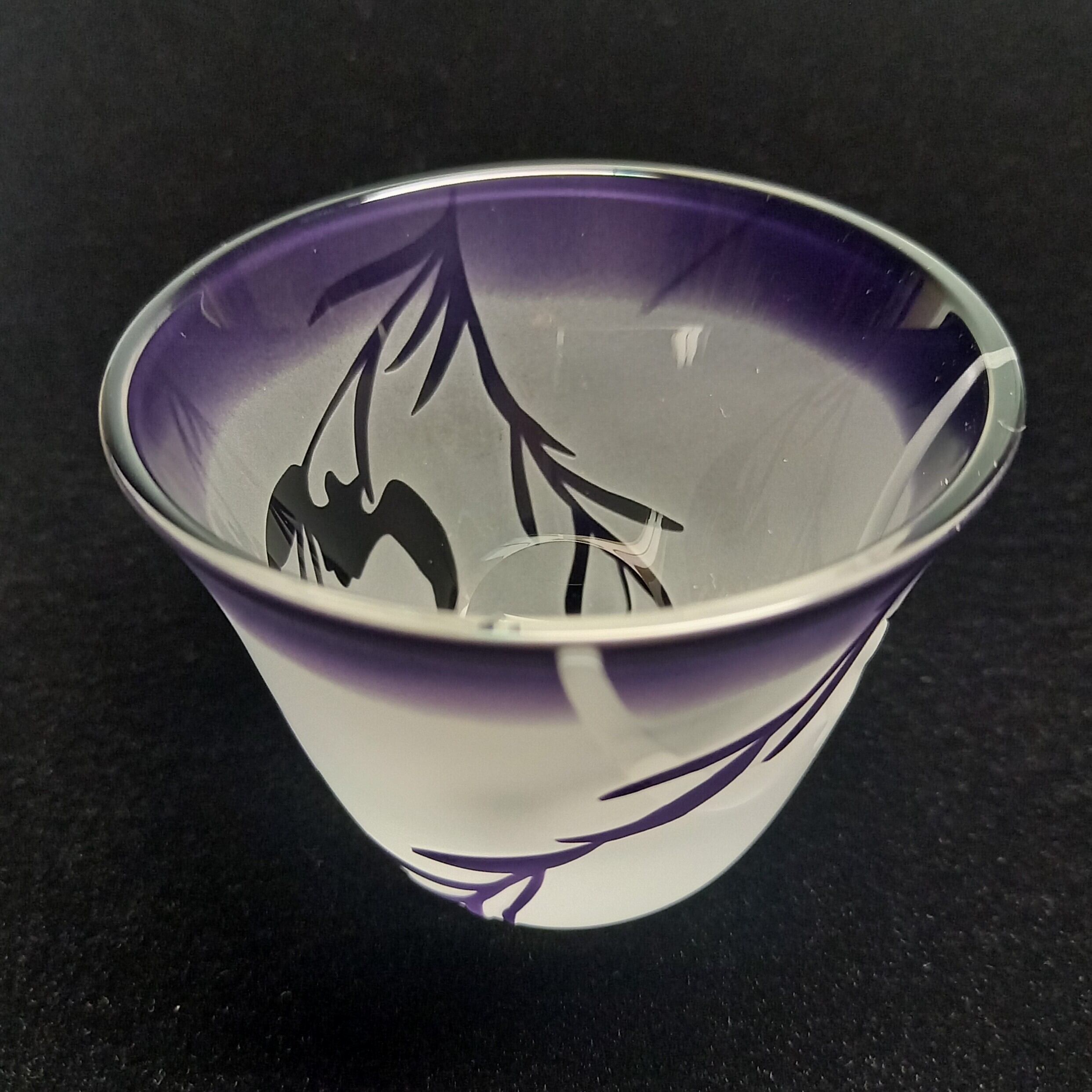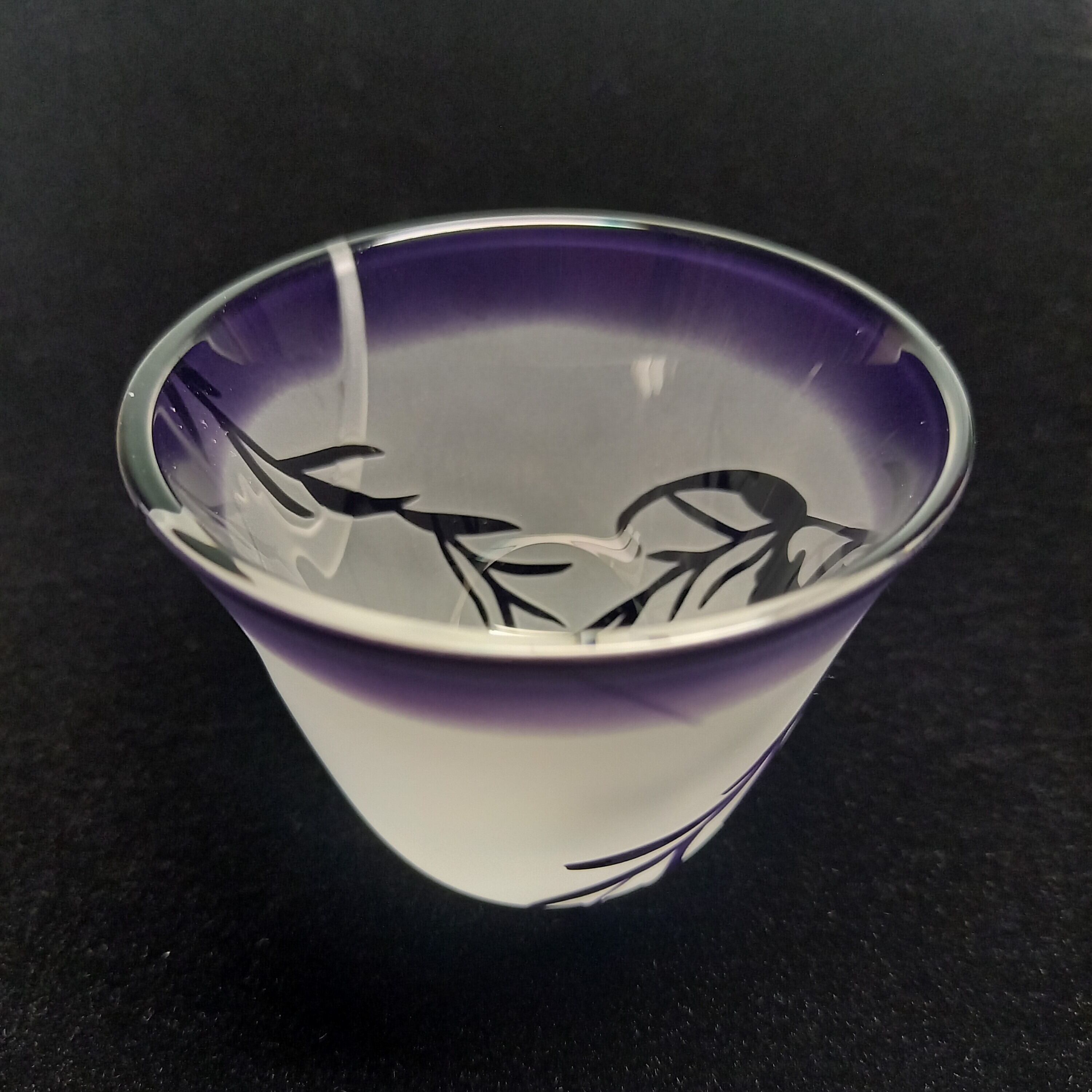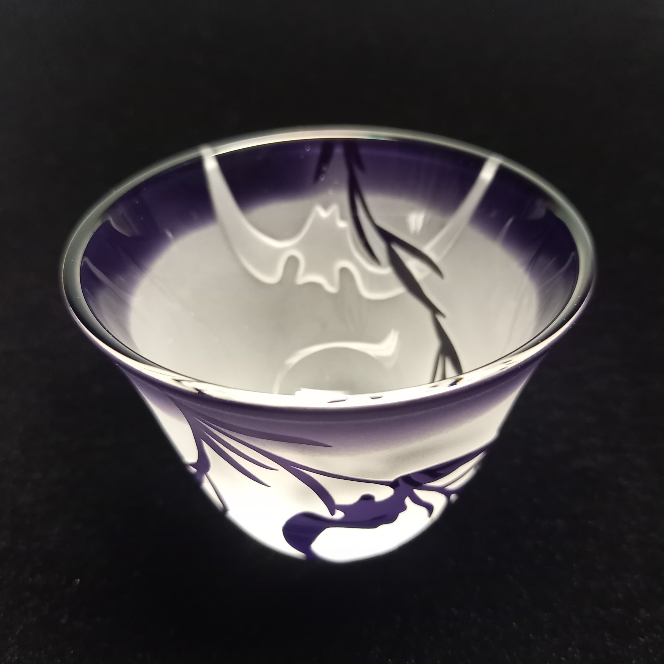 落ち着いた紫色の天開ぐい呑み形被せガラスに、柳の間を飛ぶ蝙蝠を彫りました。福を呼ぶ蝙蝠柄がシンプルモダン。