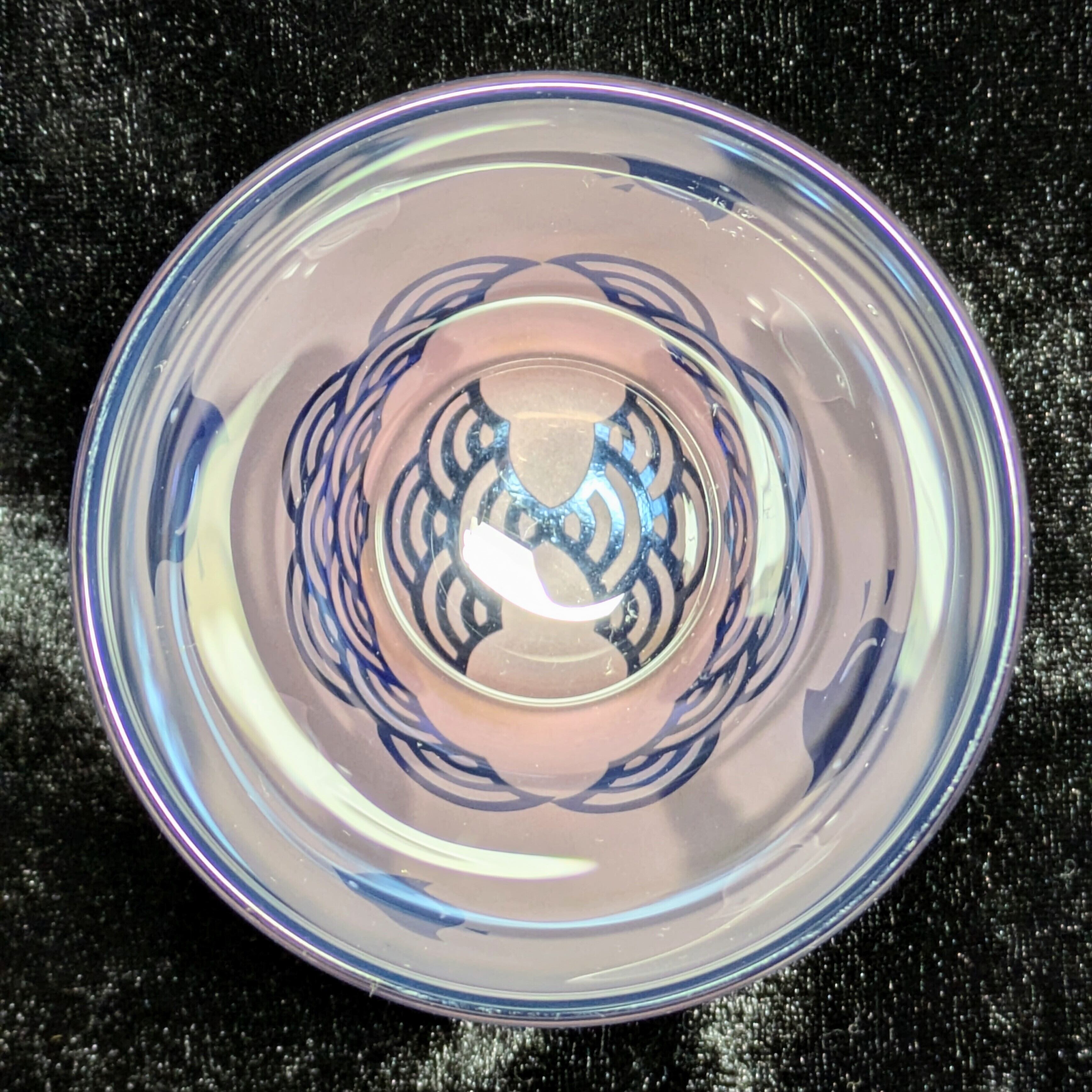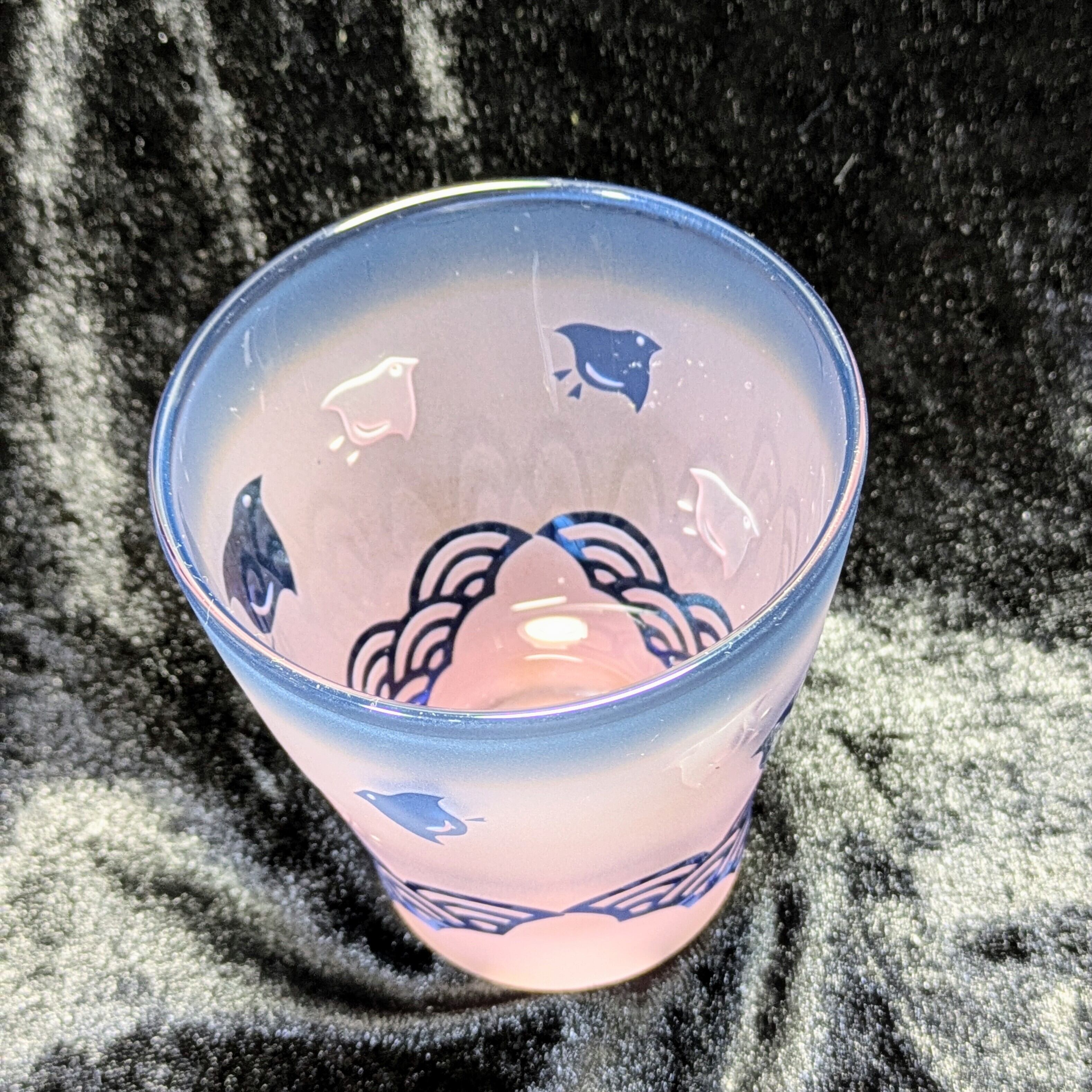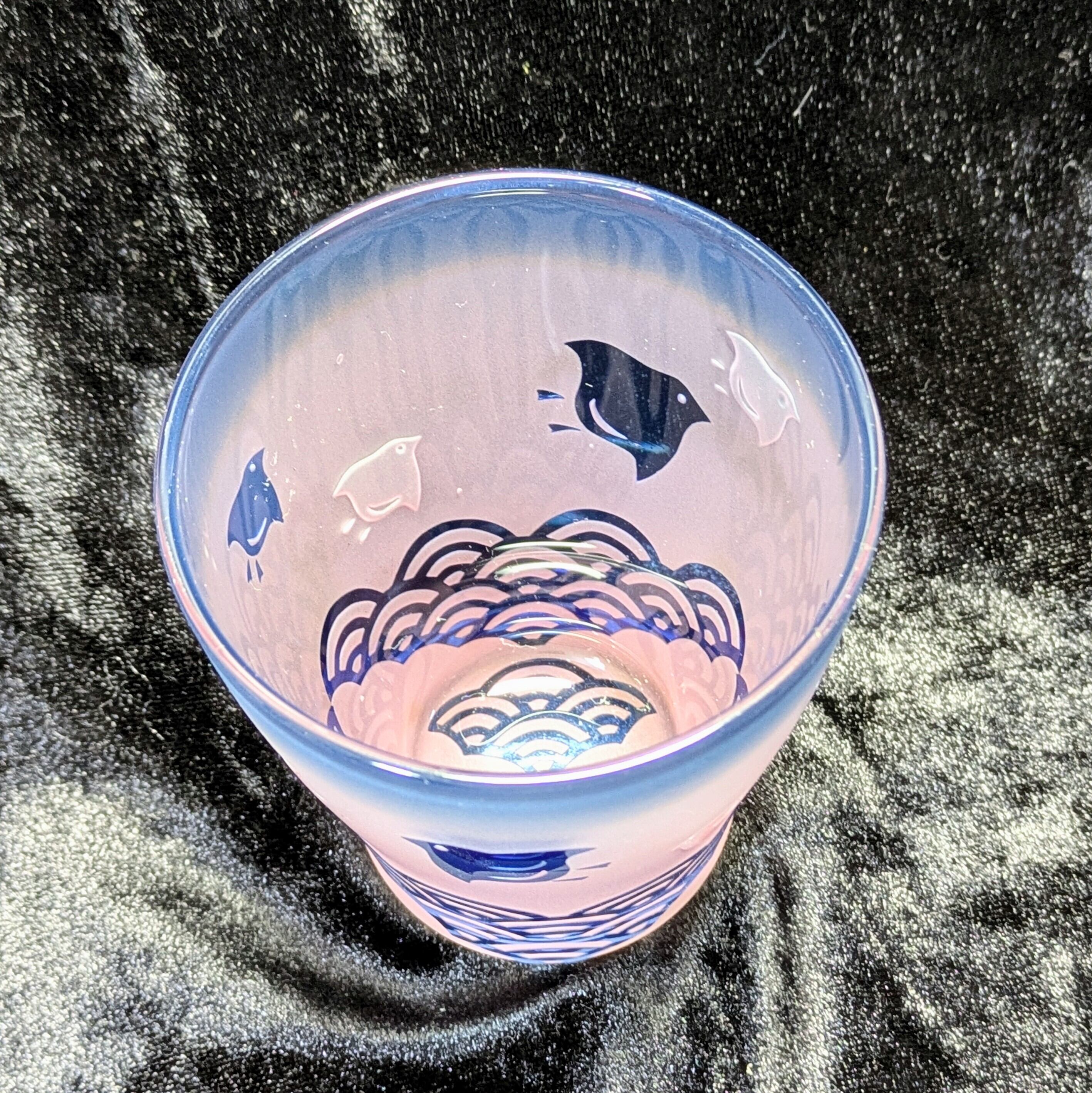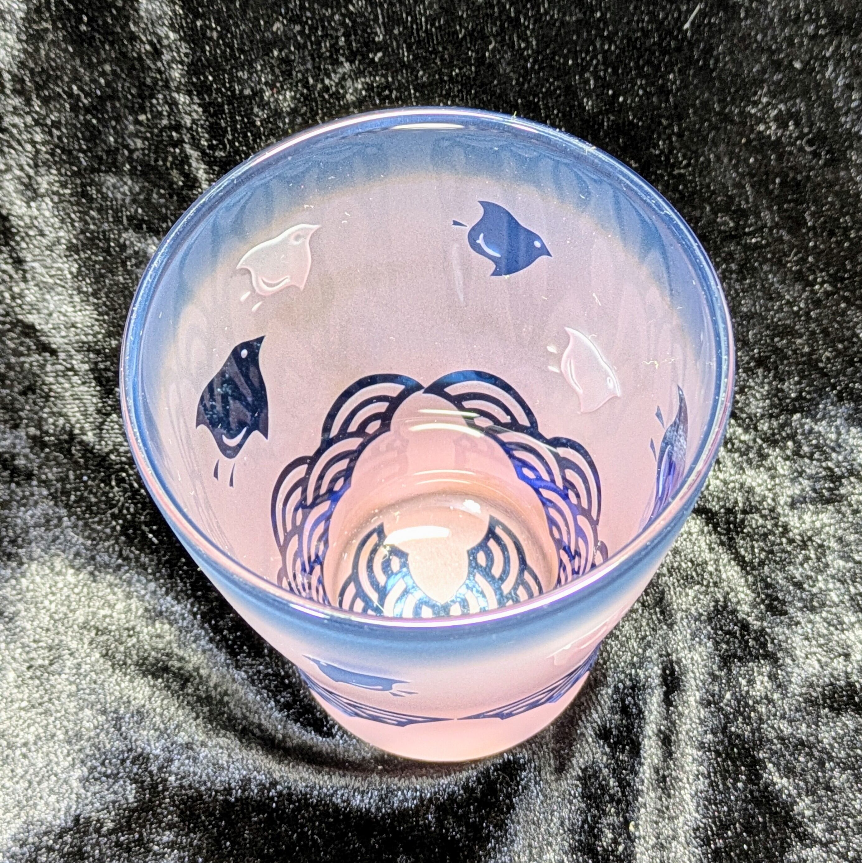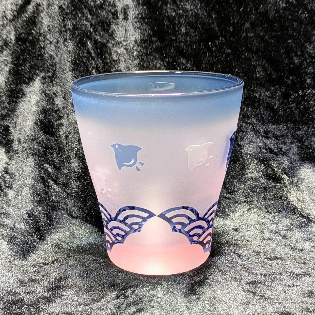 水色の下地にピンク色が透けている素材に、青海波千鳥の紋様を彫り分けました。